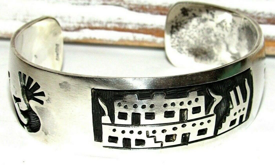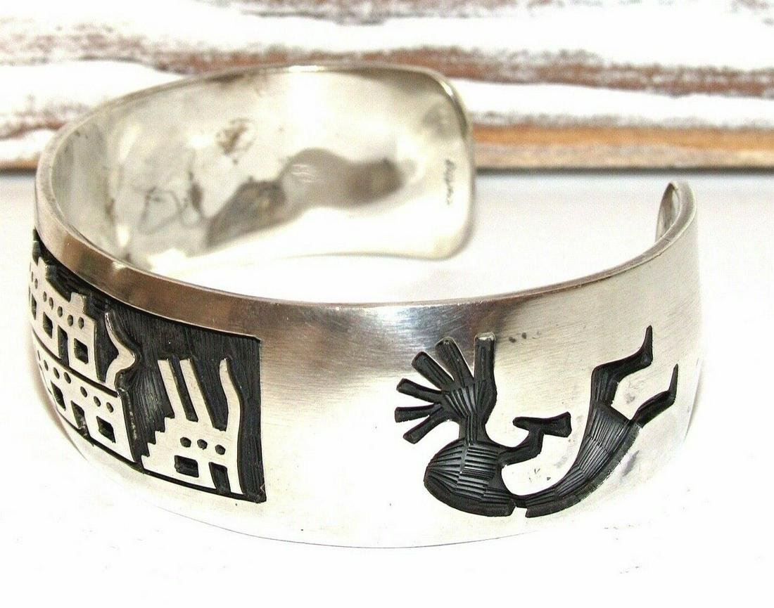 Stunning Navajo sterling silver cuff bracelet with intricately hand etched pueblo and Kokopelli designs on the front. Exceptional craftsmanship and attention to detail with traditional tribal designs that are intricately hand etched on the front and on each side. . Stamped "sterling", no visible artist hallmark. The inside circumference is about 7” including gap, the gap opening is 1 1/4". The cuff can be carefully adjusted. The bracelet is 1" wide on the front and weighs about 55Gr. Stunning example of wearable Native American art to add to any jewelry collection.