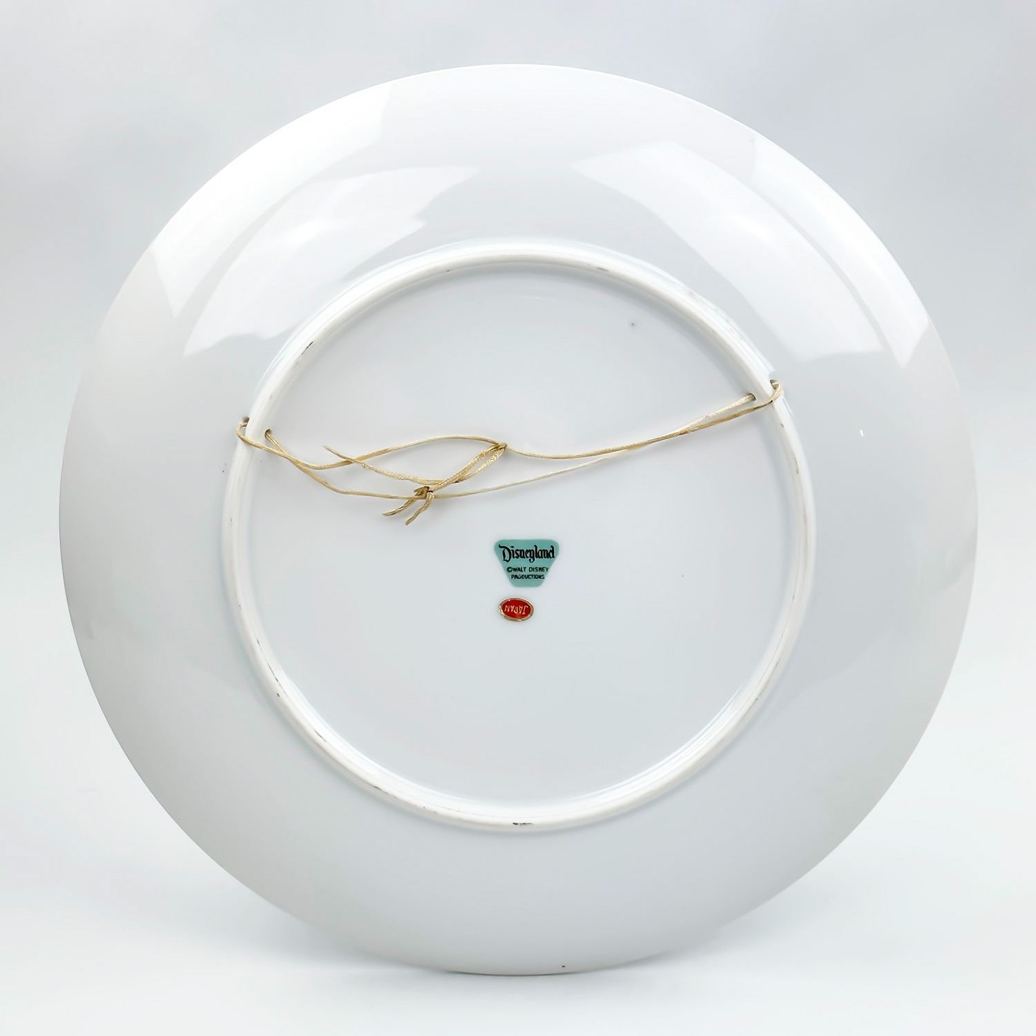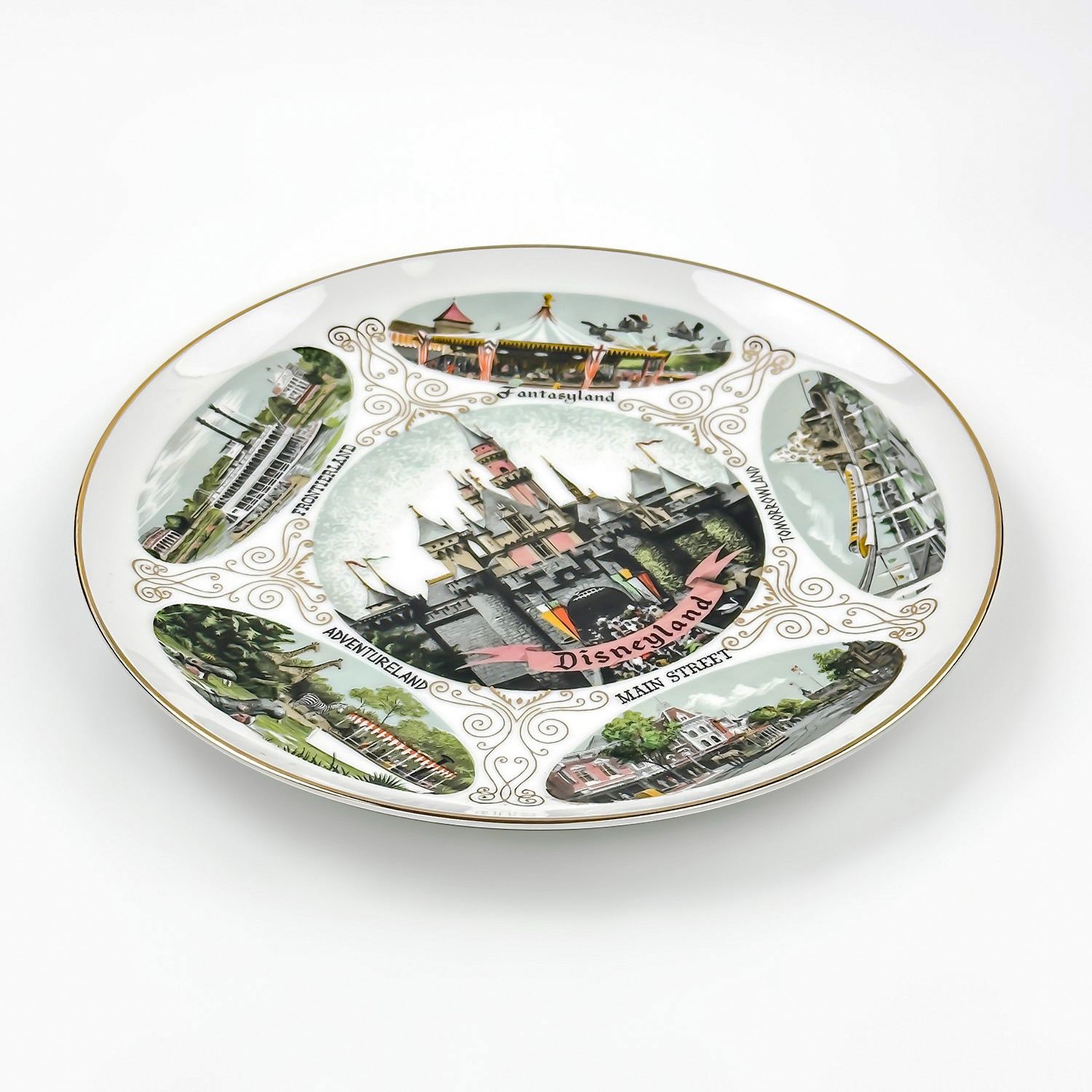 #9118 - VINTAGE 1960’S DISNEYLAND WALT DISNEY PROD. SOUVENIR PLATE WITH GOLD TRIM. THEME PARKS FEATURED: FRONTIERLAND, FANTASYLAND, TOMORROWLAND, ADVENTURELAND, MAIN STREET AND DISNEYLAND CASTLE. MEASURES: 9.5” (24 CM) DIAMETER