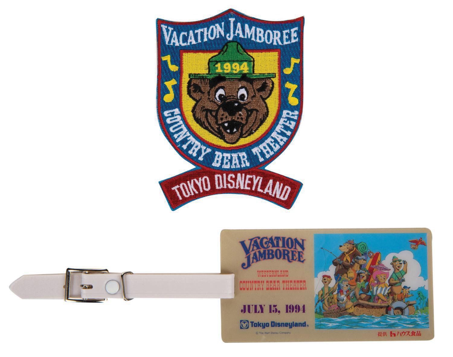 (Tokyo Disneyland, 1994) An embroidered patch and matching luggage tag created exclusively for Cast Members to commemorate the opening of Vacation Jamboree. Debuting as Vacation Hoedown (a seasonal overlay for the Country Bear Jamboree attraction at Disneyland and Walt Disney World), the show is titled Vacation Jamboree at Tokyo Disneyland. The patch measures 4.25"x3" with the luggage tag 2.5"x4.25" and both are in very fine condition.