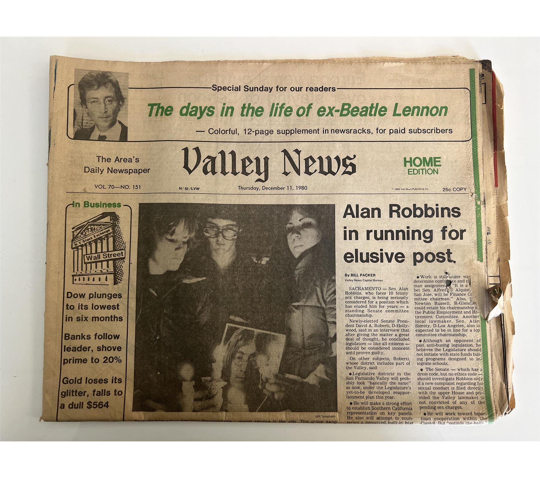 Valley News December 11, 1980 Vol. 70 No. 151 newspaper announcing John Lennon's death.13x11 inches