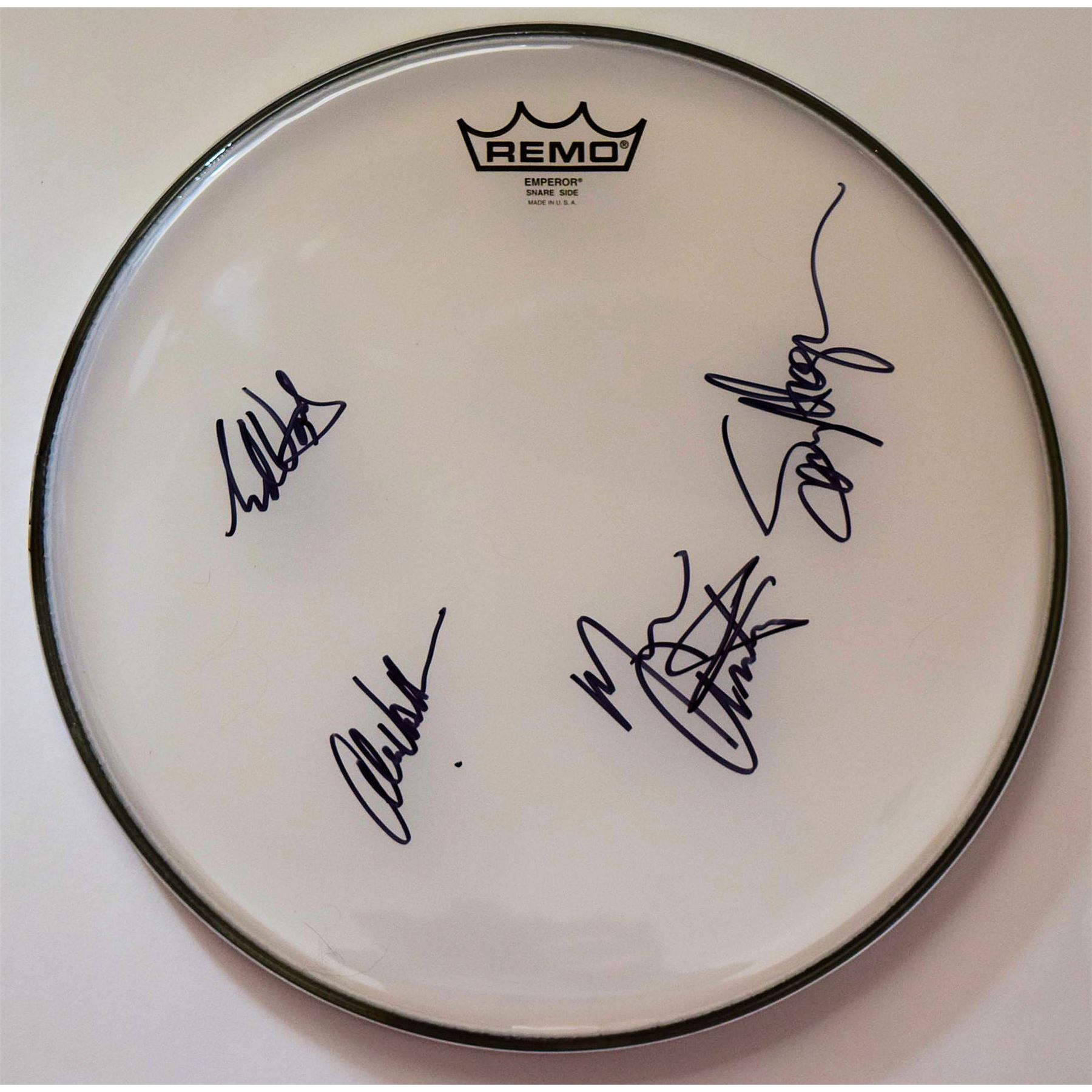 Van Halen signed 13 Inch Frosted Drum Head. Signed: Sammy Hagar, Eddie Van Halen, Alex Van Halen & Michael Anthony.