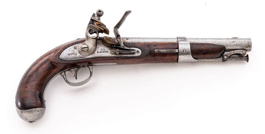 Very Rare U.S. Model 1826 Navy Belt-Hook Flintlock Pistol, by Simeon North, NVSN. .54 cal., 8.675" round barrel crisply marked "US/ET" and "P" in a sunken cartouche at breech, has brass blade front and dished-oval rear sights; beveled lockplate with rounded rear is crisply marked "U.S./S. North" under pan and "1828" to rear, has reinforced cock and separate brass pan without fence; steel furniture includes loop trigger guard with rear tang extending to round buttcap whose backstrap extends to barrel, serpentine sideplate, 4.125" left belt hook, single spring-retained band, captive swivel ramrod with button tip; 3/4-length stock of oil-finished walnut has raised panels at either side of lock and oval inspector's mark at left. Mfg'd ca. 1826-29, in just 3,000 qty. Condition is near fine retaining no original brown but being smooth gunmetal gray with sharp edges and details. Stock shows minor marks, remnant oval inspector's cartouche, a .5" crack from breech to top sideplate screw, a .75" chip out at right-front, and lovely grain, color and finish. Lock appears to be original flintlock with unbushed touchhole and original parts. Action is crisp, smoothbore is bright with a patch of erosion at right. This is an exceptional example of the last U.S. military pistol made by S. North and very rare, as most were altered to percussion. Est.: $2,000-$2,500. (Antique)