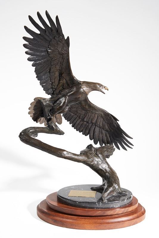 To the unaided eye, this piece appears to be in very good condition. There are no signs of damage or restoration to the bronze and the surface finish is consistent and free of corrosion. The piece is mounted to a black marble and stained wooden base. The base is in good condition, although the piece itself and the marble portion of the base are somewhat loose in their mounting. Plate: James E. Herndon, In recognition of outstanding service to Centex Corporation and J.W. Bateson