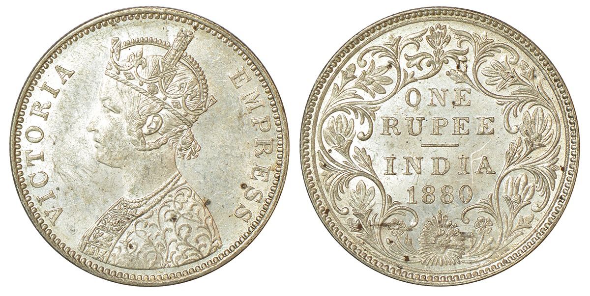 Victoria Empress, silver rupee, 1880, Bombay mint, A3/II(i)/dot, unlisted in PR; GK 465, 11.62g.