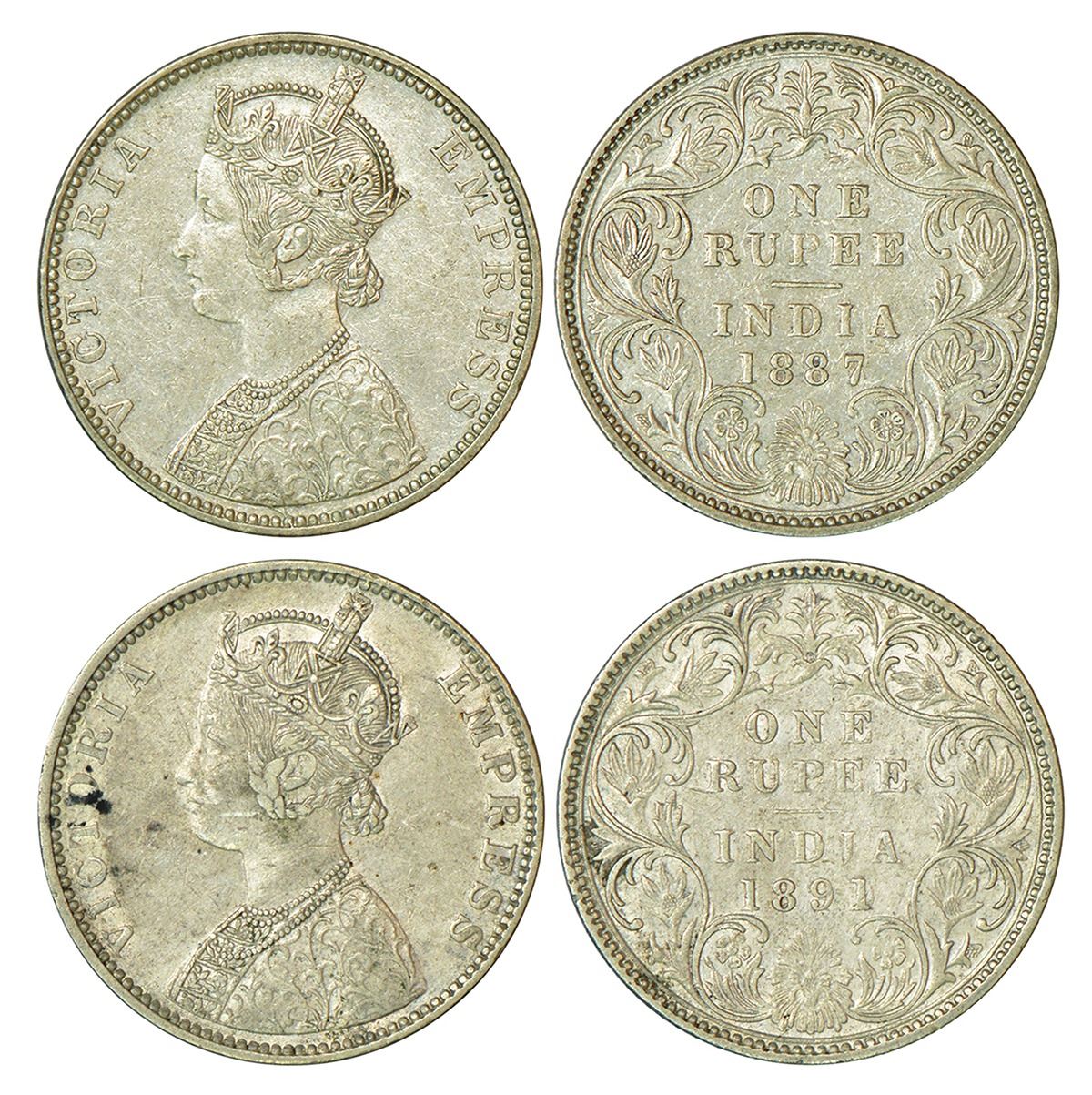 Victoria Empress, silver rupee (2), Bombay mint, 1x 1887, C2/I, 'B' incused, 7 struck over 6 in date, PR 173, 11.65g and 1891, C2/I, 'B' incused, 91 over 90 in date, PR 179, GK 569, 11.62g. (2 coins)