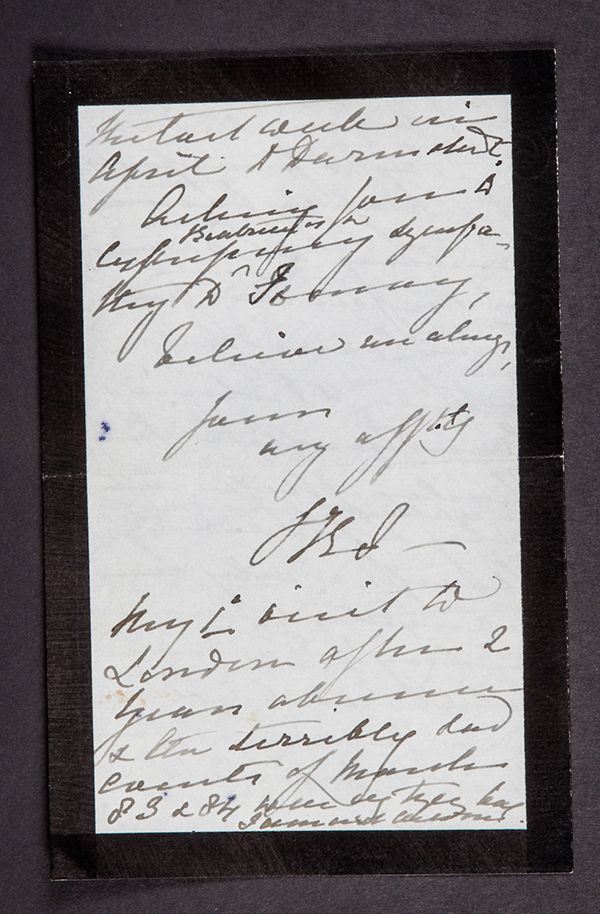 Victoria (1819-1901). Great Britain's longest reigning monarch (1837-1901). Autograph letter signed ("VRI" [Victoria Regina Imperatrix]), Windsor Castle, 22 March 1885. To Lady Southampton (Victoria's Lady of the Bedchamber from 1878 to the Queen's death in 1901): "I am so grieved to hearof poor Ismay's disppointment and sorrow in losing her babyI think it is so hard to go through all that trouble, discomfortfor so long, suffering for nothing! I pity you so much tooA sad event has again this year happened to destroy the bright prospects of a happy family meeting at Darmstadtthe deathof the Grand Duchess's Mother, & Victoria's Grandmother, princess Charles of Hesse - an excellent person, after only a few days illness." In a postscript, she adds, "My 1st visit to London after 2 years absence and the terribly sad events of March 83 & 84." referring to the death of John Brown on March 27, 1883 and, one year later on March 28, the death of her haemophiliac son Leopold whom she lamented as "the dearest of my dear sons."