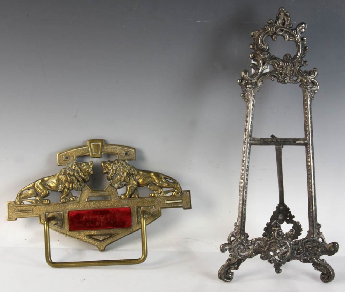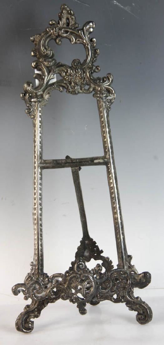 Victorian silverplated diminutive easel, 16" x 6 1/2", with tie rack, 7 1/2" x 11". Provenance: North Andover, Massachusetts estate.