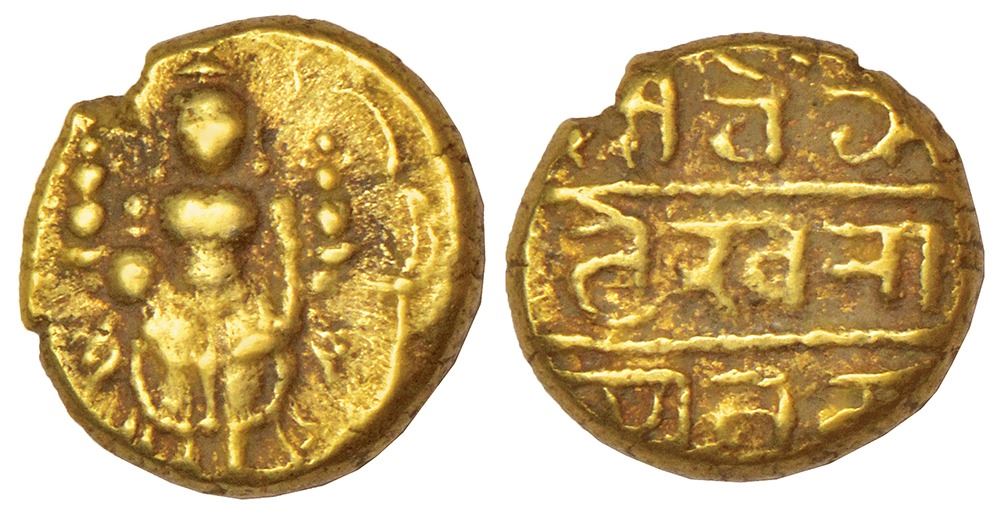 Vijayanagar Kingdom, Aravidu dynasty, gold varaha of Venkata Raya III (1630-1642 AD), MCSI-I 833, 3.32g. Obv: Venkateshwara (Balaji) standing under archway. Rev: Devanagari legend Sri Venkateshwaraya Namah in three lines.