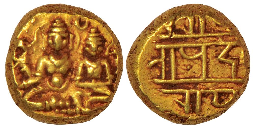Vijayanagar Kingdom, Sangama dynasty, gold pagoda of Pratapa Devaraya I (1406-1422 AD), Girijapati 68-73, 3.40g. Obv: Shiva Parvati seated. Rev: Devanagari legend Sri Pra/tha Padeva/raya in three lines.
