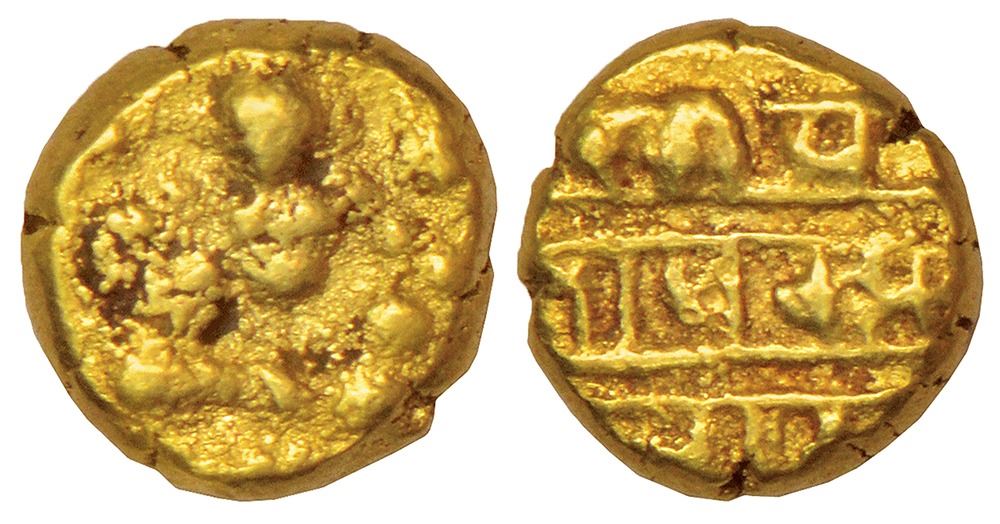 Vijayanagar Kingdom, Tuluva dynasty, gold ½ pagoda of Pratapa Krishnadeva Raya (1509-1529 AD), MSCI-I 643-644, 1.70g. Obv: Bala Krishna seated facing. Rev: Nagari legend Sri Pratapa Krishna Raya.