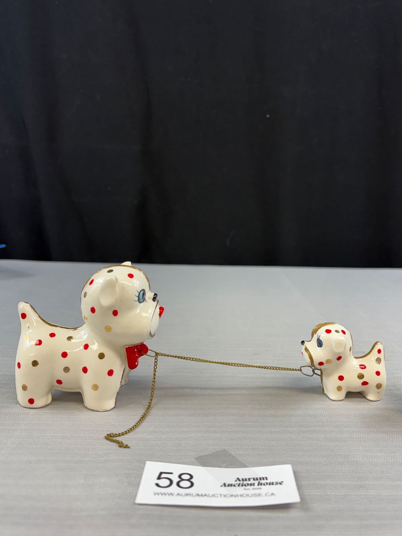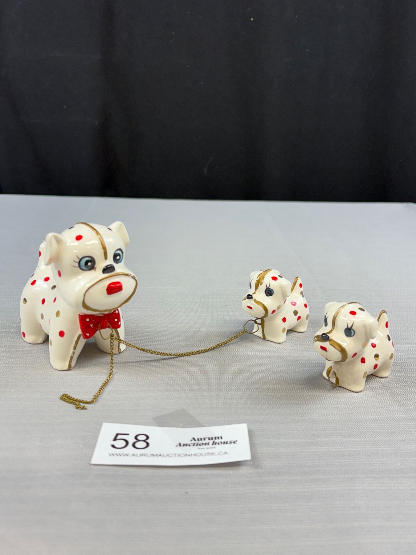 Vintage C.1950s Retro Spotted Dog + Puppies Ceramic Ornaments, Adorable!