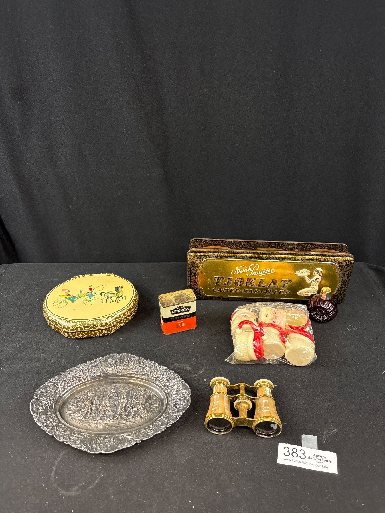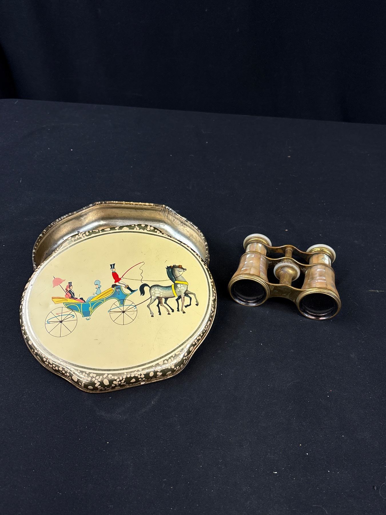 Vintage Collectible Lot, Mother of Pearl Opera Bernoculars, Tins, Etc