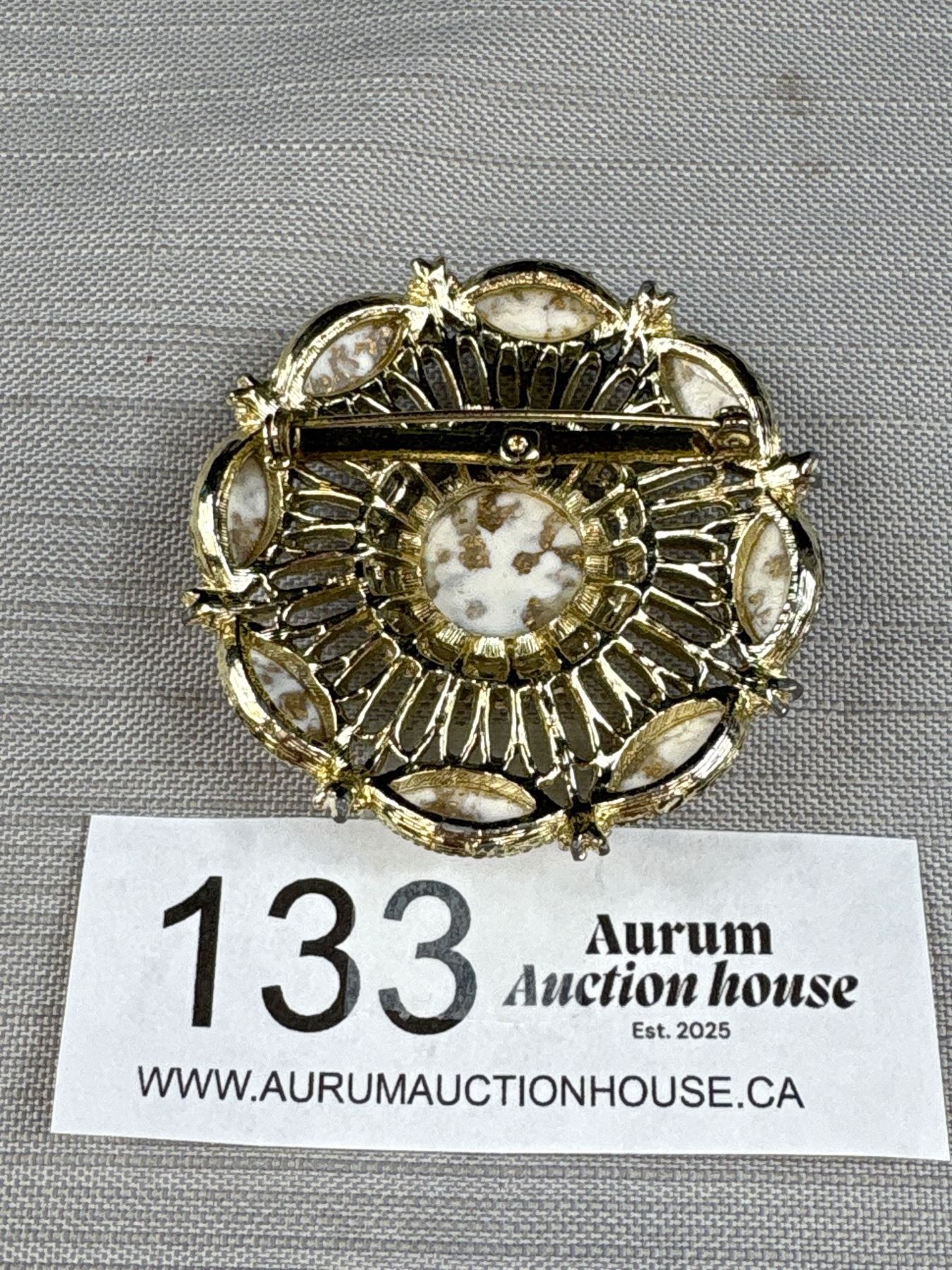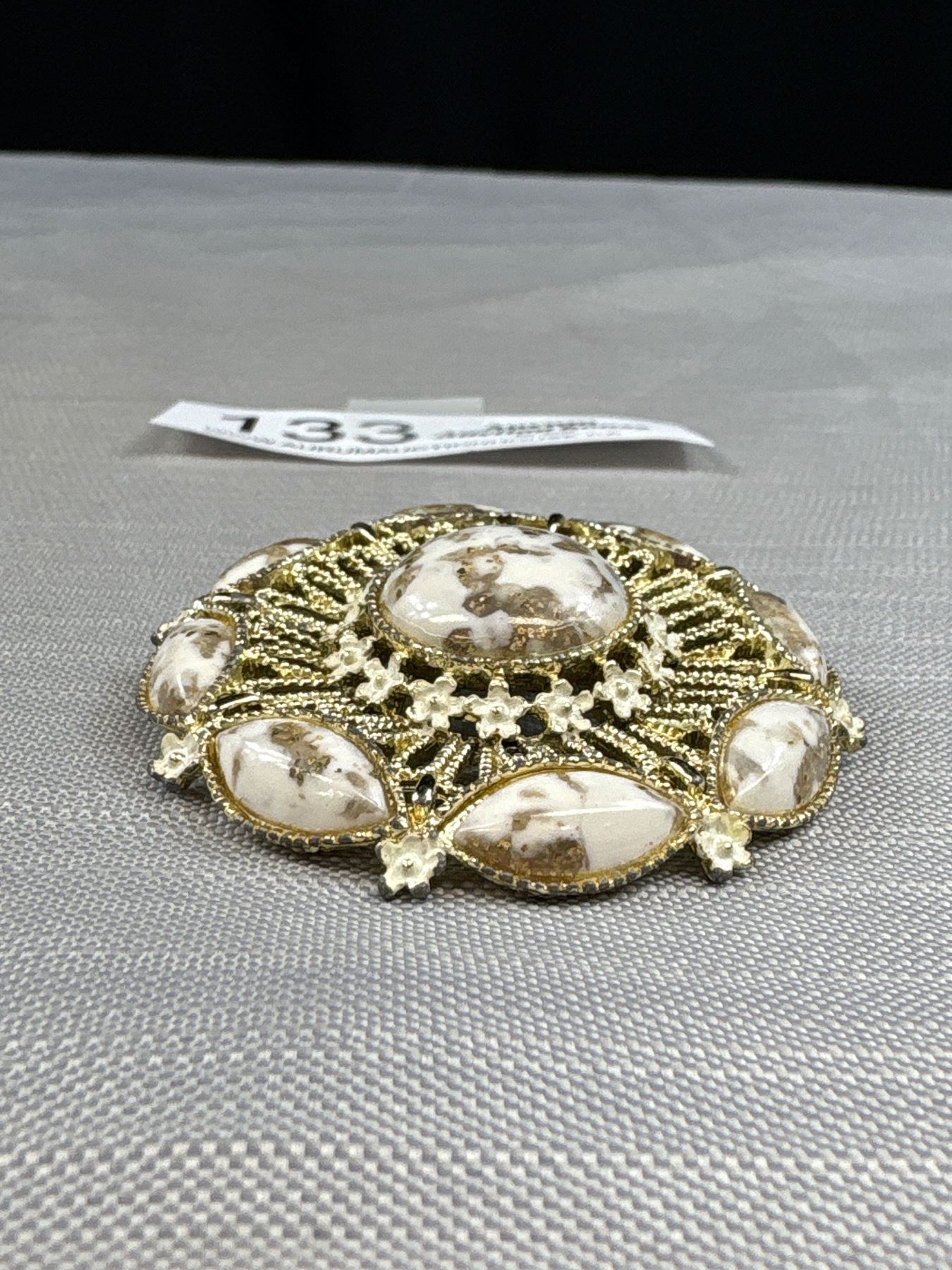 Vintage Cream Brooch/Pin Gold Stone Glitter Cabs w/ Round Open Goldtone Work