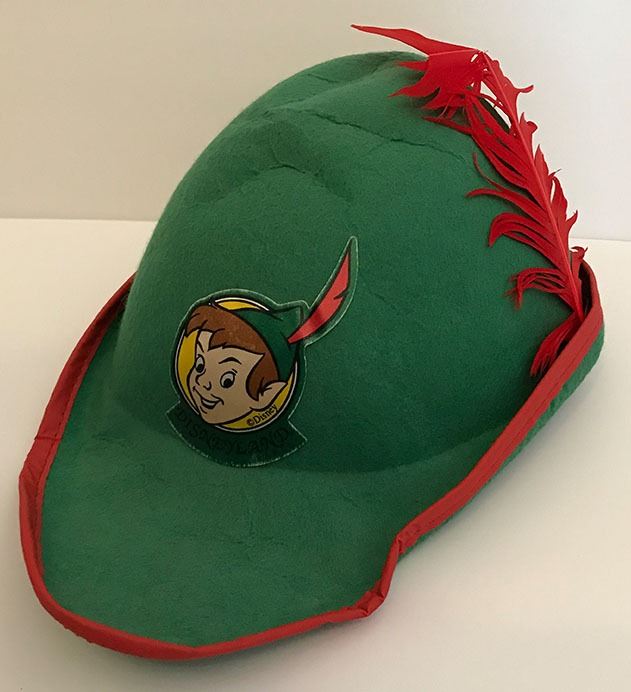 (Disneyland, c. 1980's). A rare Disneyland Peter Pan hat featuring Peter himself and in the style of his feathered hat. The hat is in fair condition with some wrinkling from use. Item comes with a Grand Circle Tour Auctions COA.
