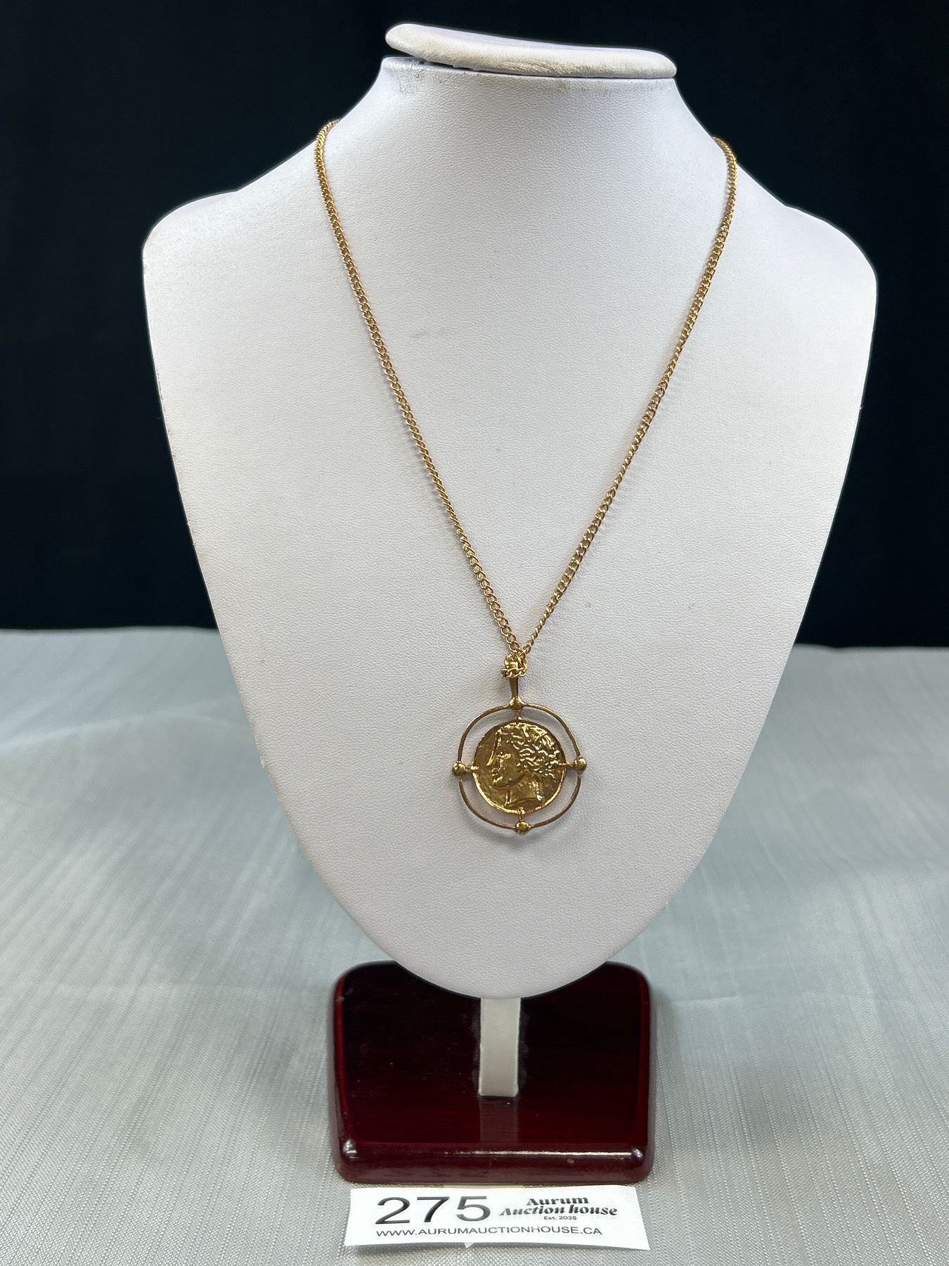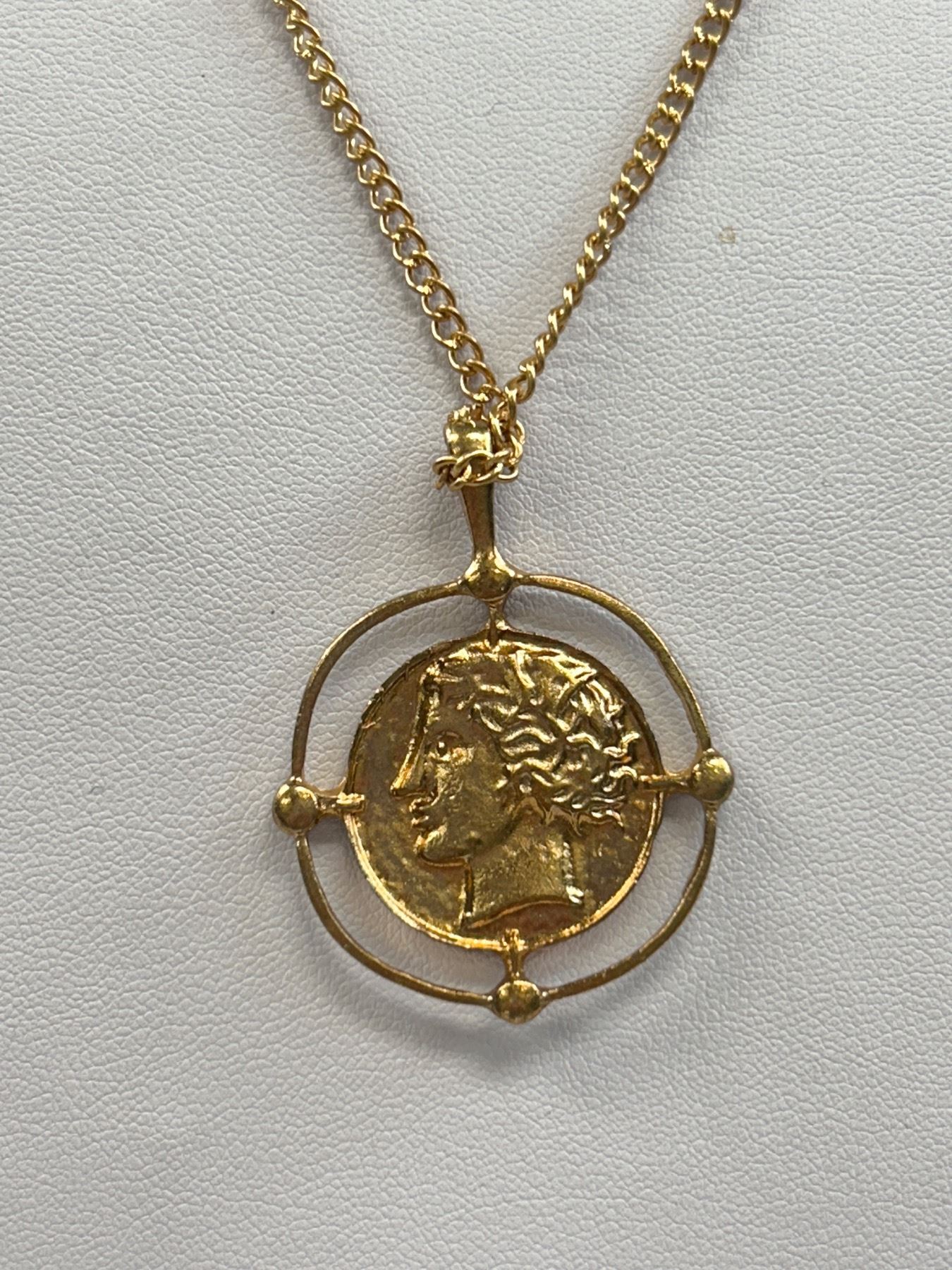 Vintage Gold Tone Coin Design Pendant w/ Chain Necklace