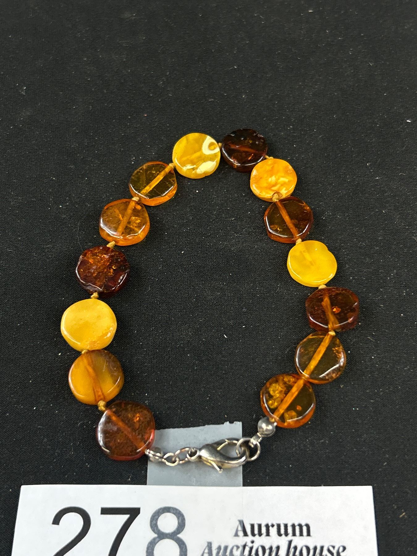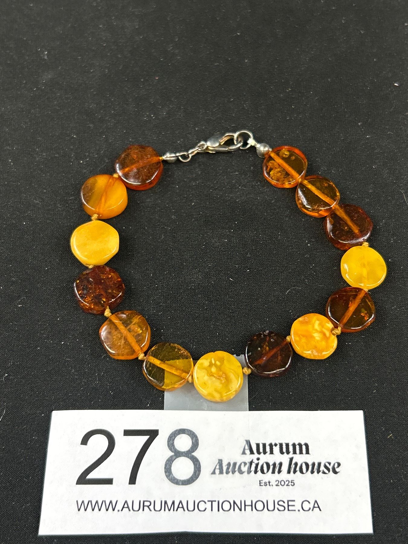 Vintage Hand Crafted Genuine Amber Stone Disks Links Bracelet, Lobster Clasp