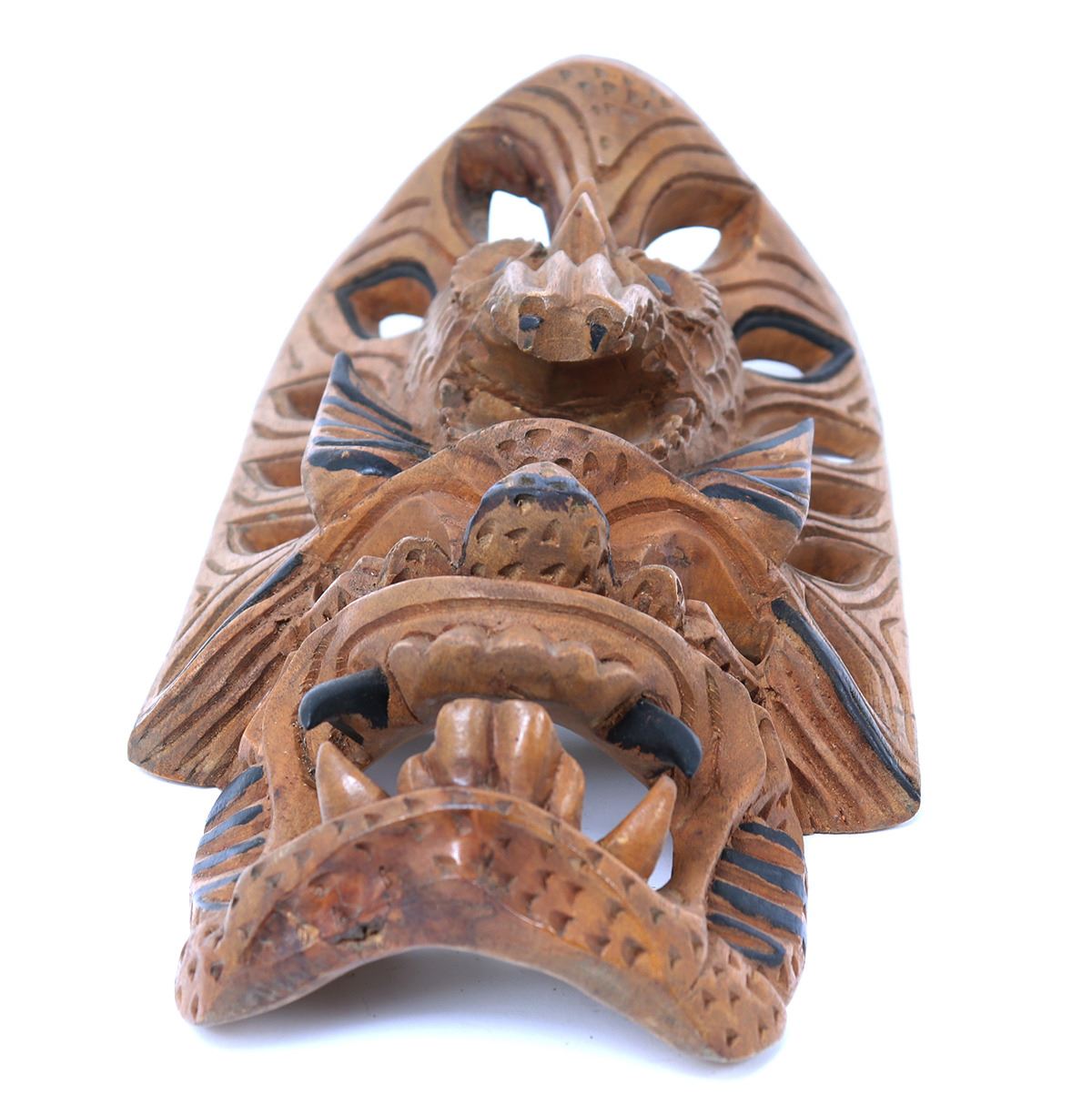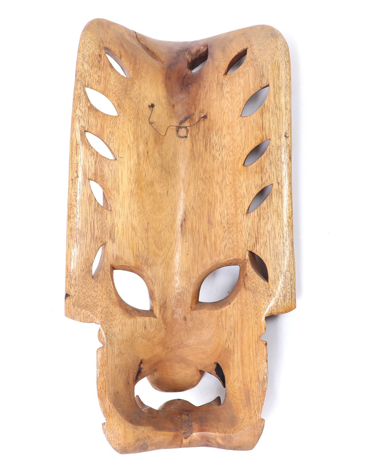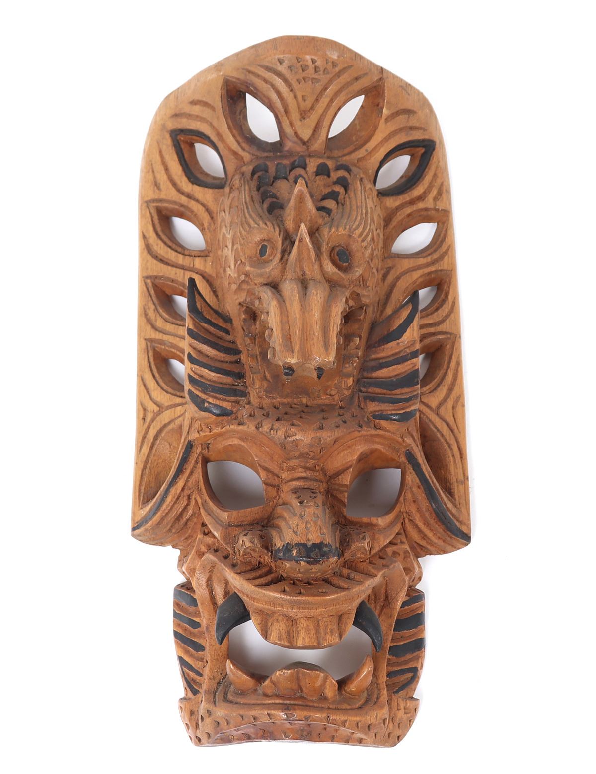 Tall hand carved Ifugao double dragon mask with open pierce work throughout. Dragons each carved in high relief, with painted detailed throughout. Size 16 3/8" L. Condition: Well preserved condition throughout.