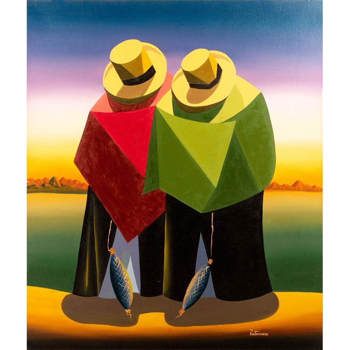 Paint on canvas. Cubist-style figure painting depicts 2 fishermen with fishing lures in hands. Stunning, rich coloration. Figures in traditional dress standing on the shore as they wait to catch fish. Signed Portocarrero lower right. This piece may be attributed to Jose Portocarrero, a Peruvian artist. Minor missing paint spot.
