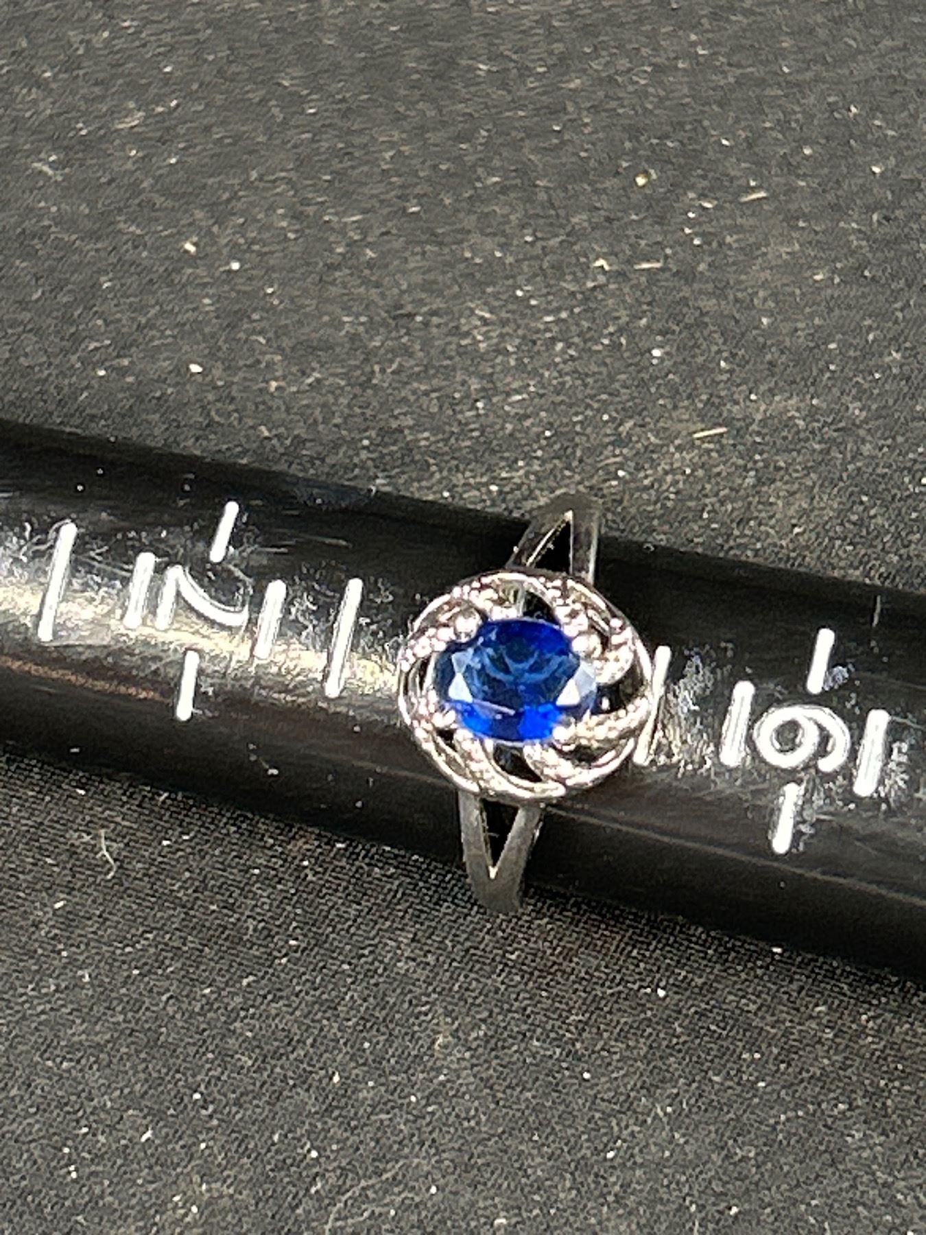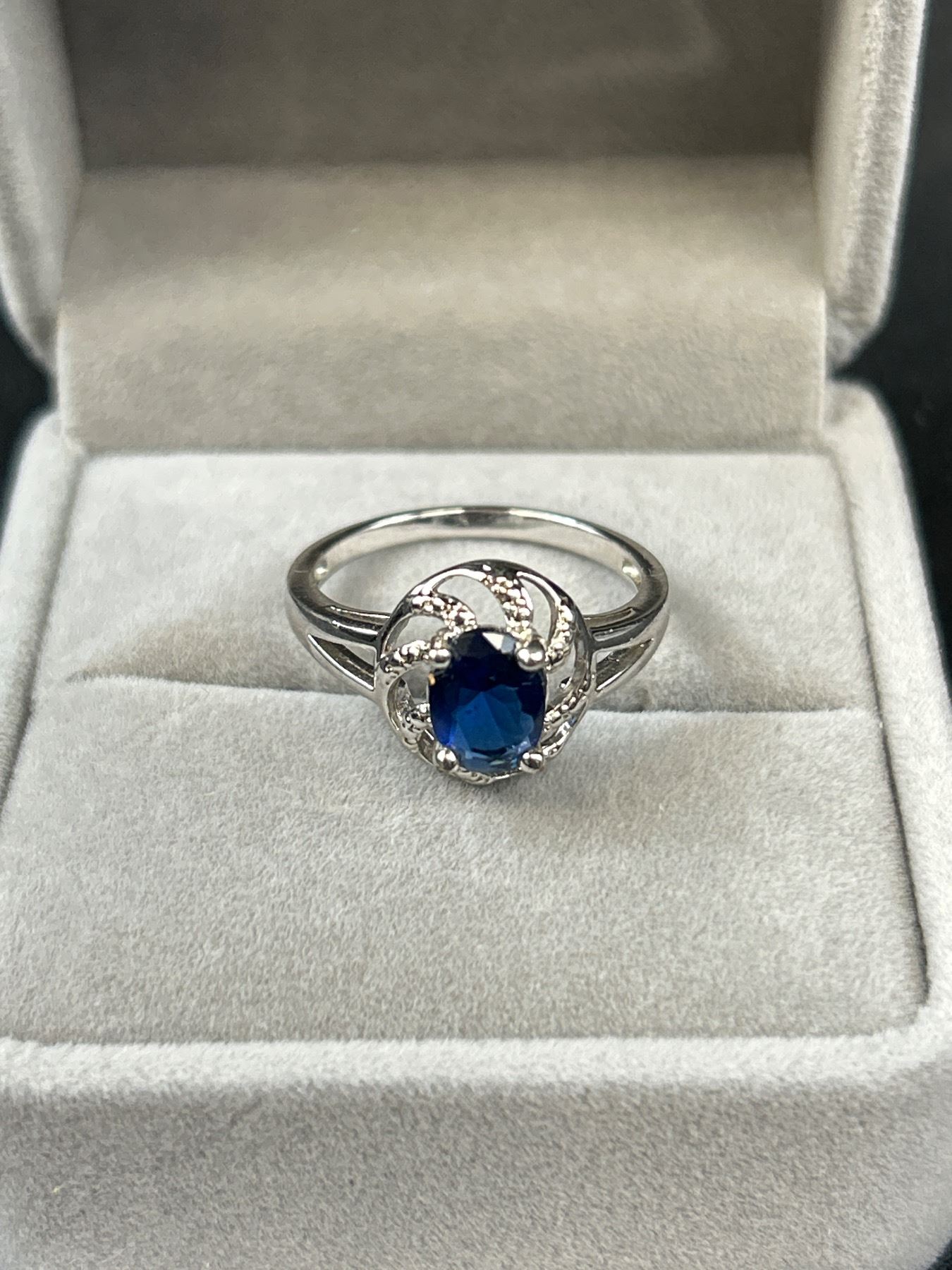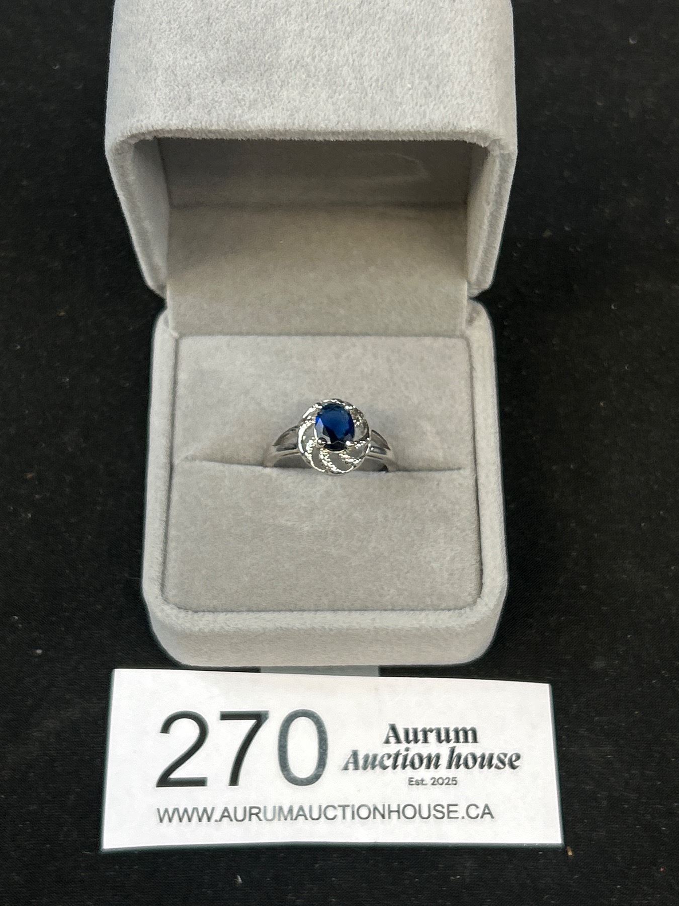 Vintage Silver w/ Blue Sapphire Stone Ring, Size 8. In Grey Ring Box
