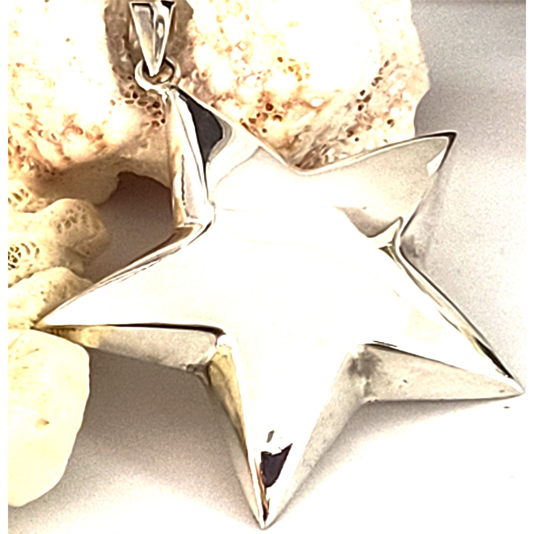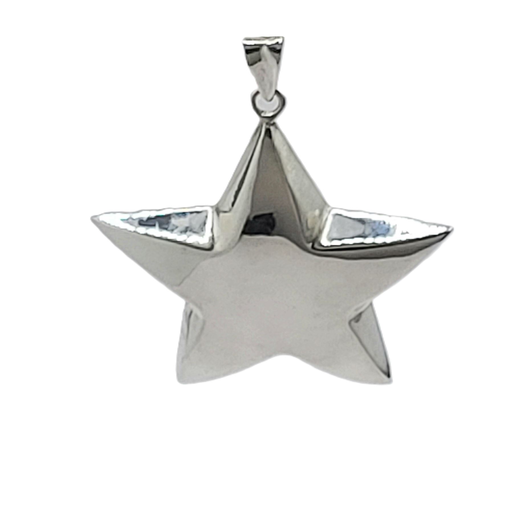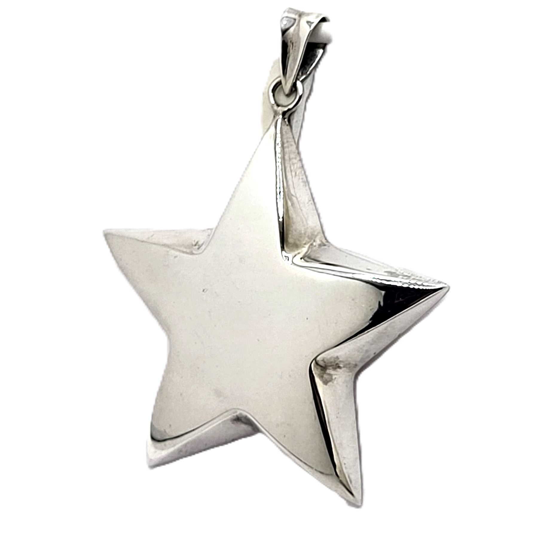 If you already know you are a super star, this is the pendant for you. If you know someone who needs reassuring, here is the perfect gift!& nbsp; This sterling silver star pendant is approximately 2& quot; in diameter and 6.4mm thick.& nbsp; It is semi-solid and hangs from a solid bail that can accommodate an approximate 3.5mm wide chain.& nbsp; The hallmark for the pendant is inside the bail. Circa mid-1980's. Admin: 33120/18bb
