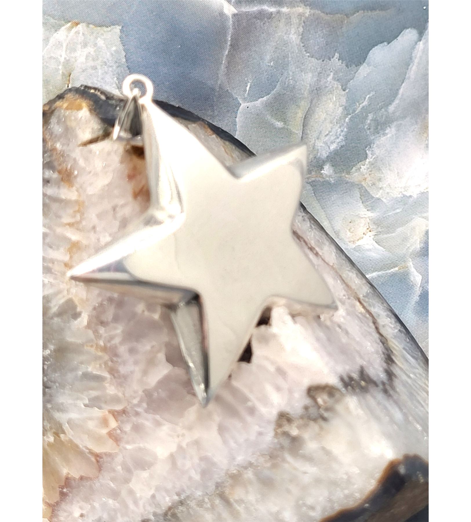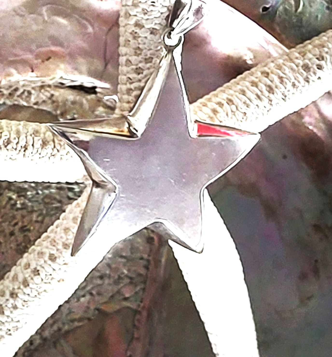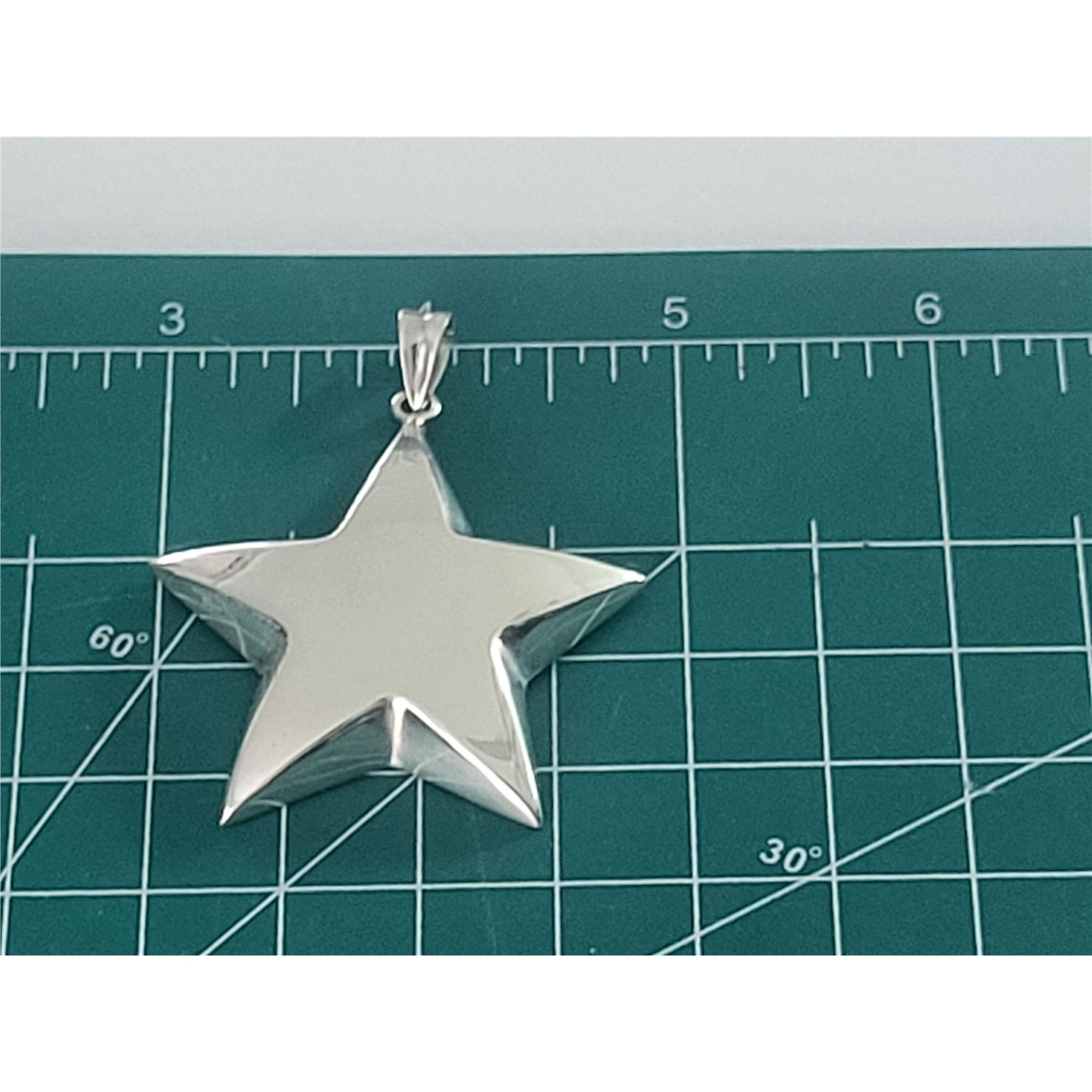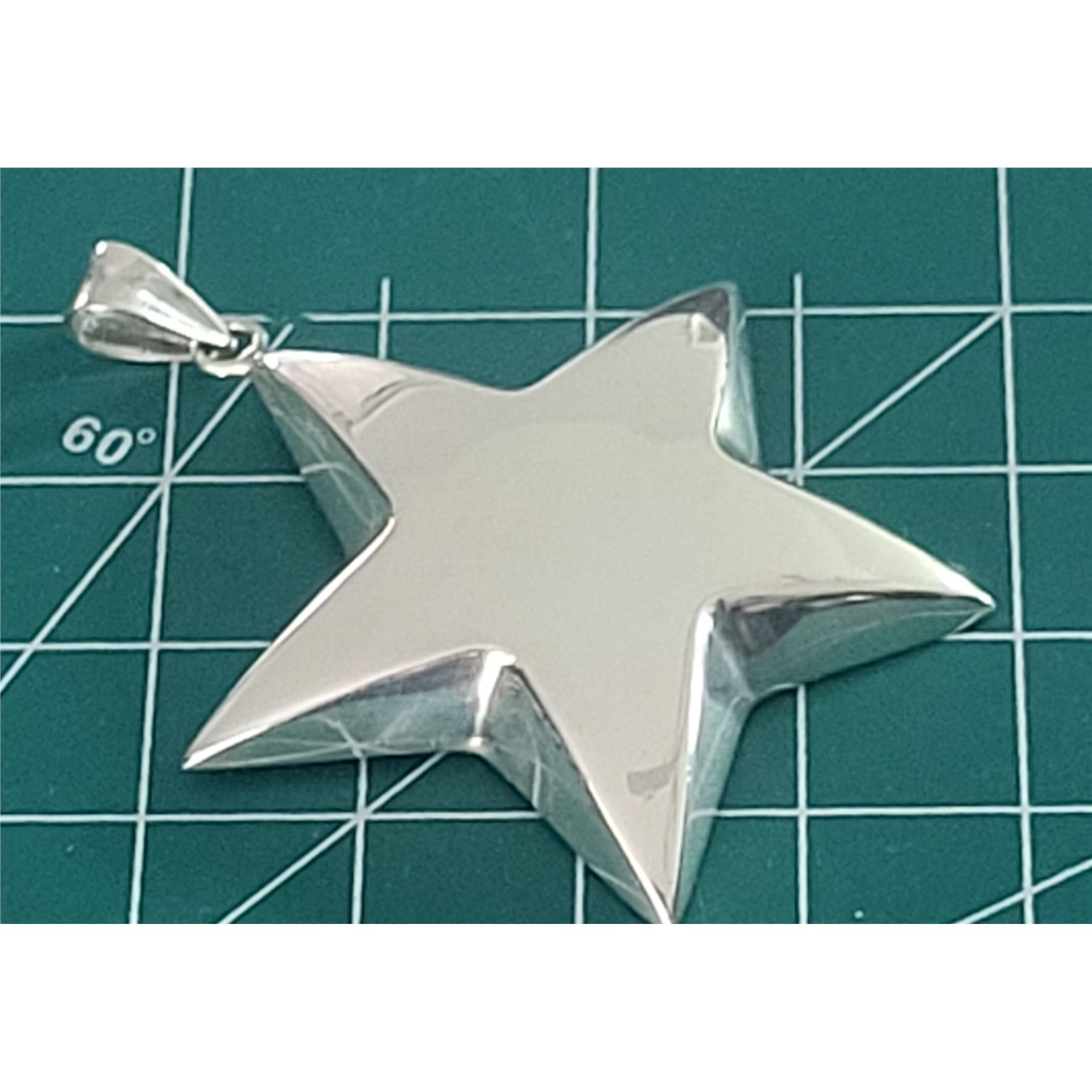 If you already know you are a super star, this is the pendant for you. If you know someone who needs reassuring, here is the perfect gift!& nbsp; This sterling silver star pendant is approximately 2& quot; in diameter and 6.4mm thick.& nbsp; It is semi-solid and hangs from a solid bail that can accommodate an approximate 3.5mm wide chain.& nbsp; The hallmark for the pendant is inside the bail. Circa mid-1980's. Admin: 33120/18bb