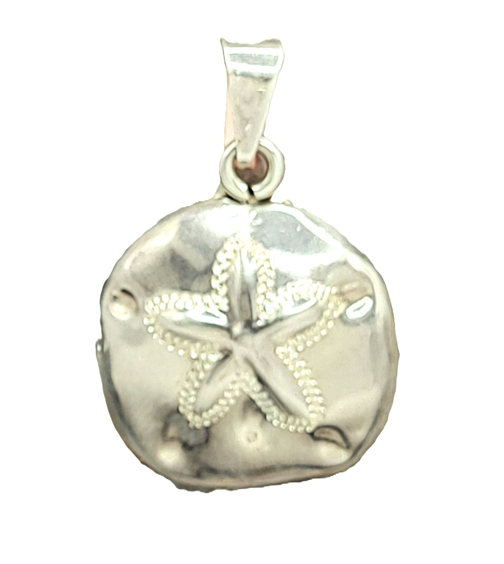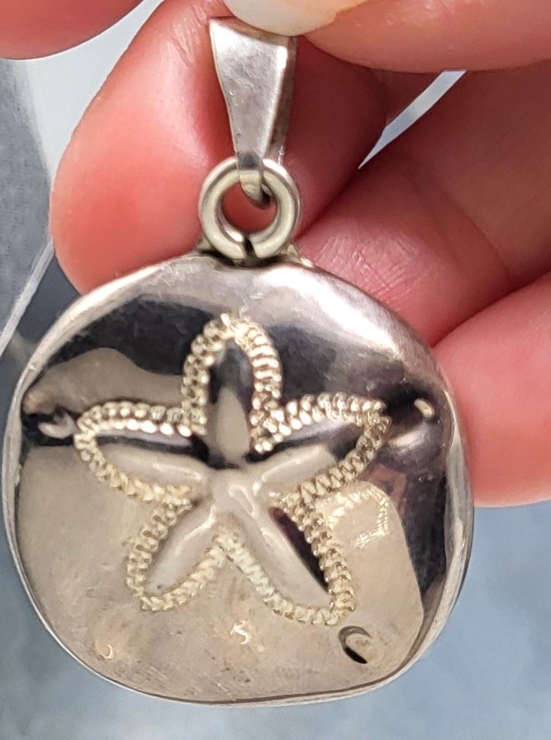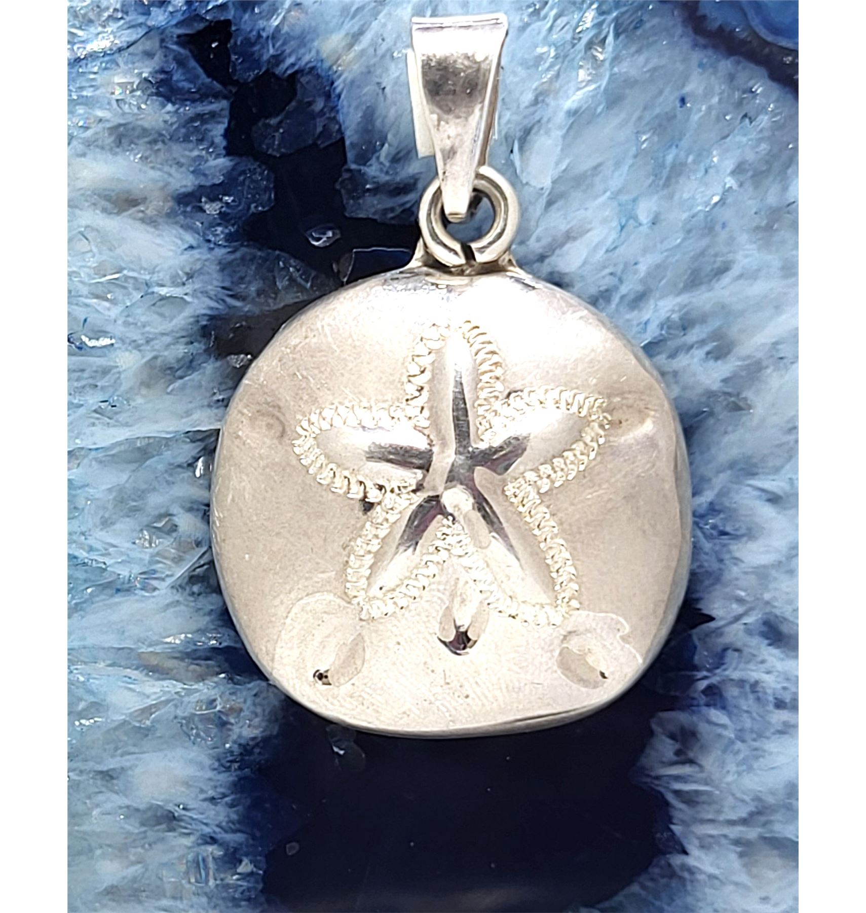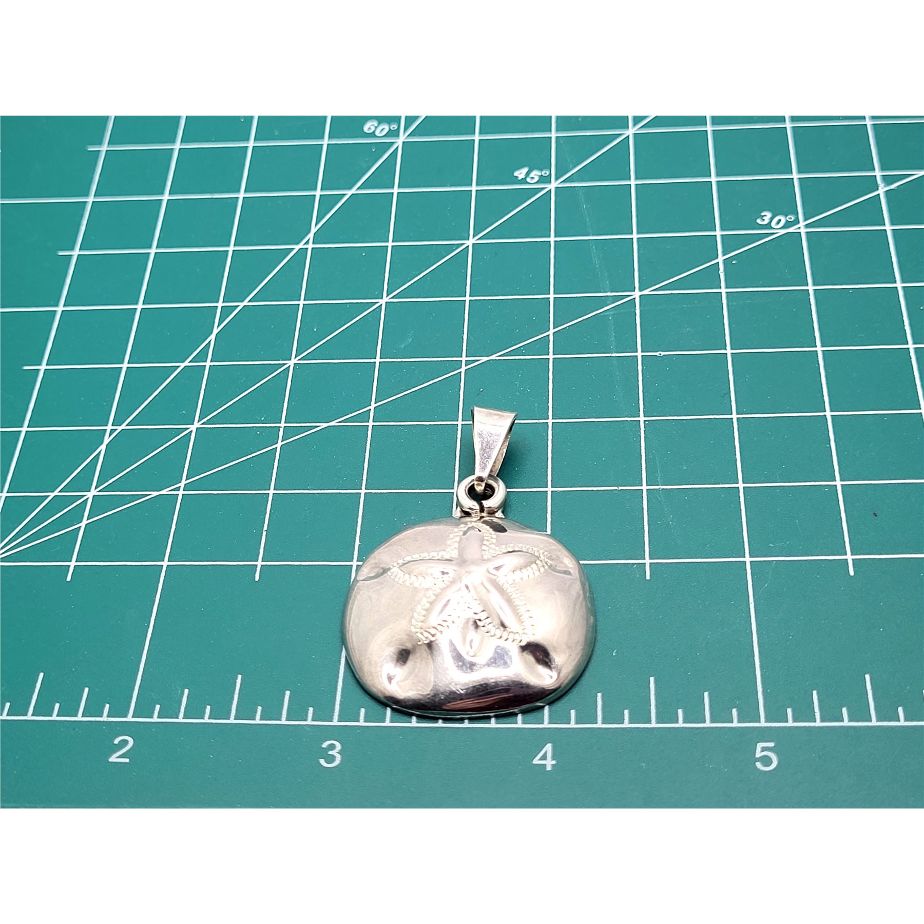 This is a vintage Taxco (TS-4N) sterling silver (.925) semi-hollow pendant, circa early 1980's. The pendant is approximately 1.25& quot; in diameter, excluding the bail.& nbsp; It has the raised bas-relief sand dollar design.& nbsp; The sand dollar has a beaded outline and the appropriate & quot;dimples& quot;.& nbsp; The pendant is crafted using 2 sheets of sterling silver and stamping them together after the design has been created.& nbsp; The pendant has a large bail that can accommodate an approximate 5.5mm wide chain. The hallmark for this pendant is located inside the bail. PLEASE NOTE: The sand dollar pendant is not perfectly round, but nor is it & quot;banged up& quot; and dented as it may appear in some photos.& nbsp; There are five dimples on the face of the pendant that were intentionally made by the craftsman. The reflective shine of the polished silver creates the illusion of & quot;pings& quot; and colors from items nearby when the photos were taken. ForOfficeUse: 33120/11bn