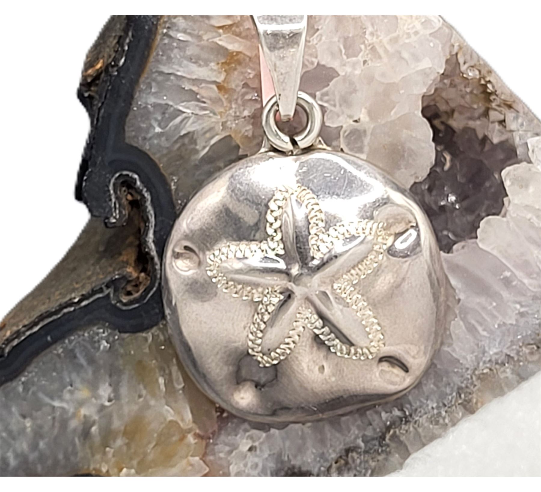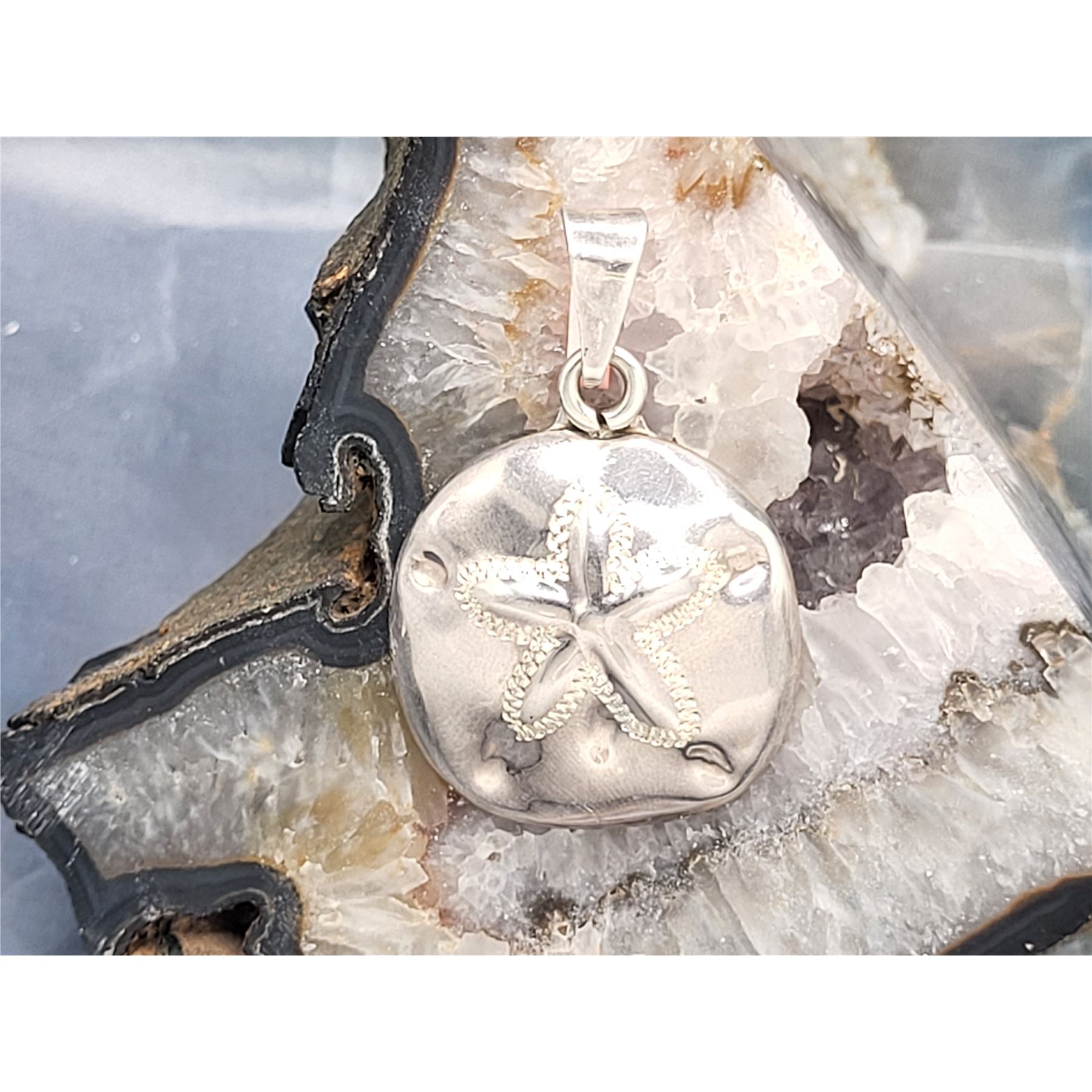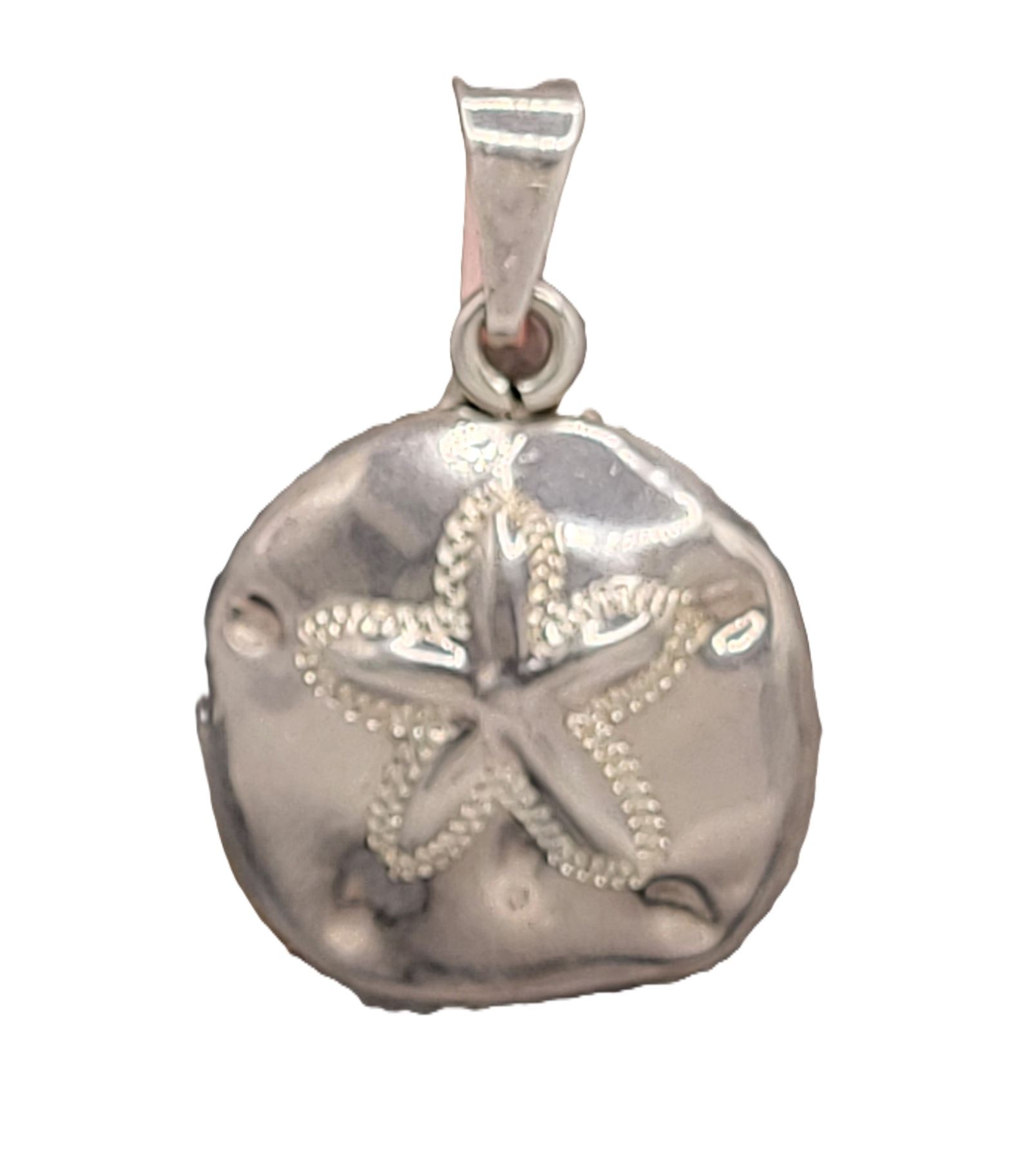 This is a vintage Taxco (TS-4N) sterling silver (.925) semi-hollow pendant, circa early 1980's. The pendant is approximately 1.25& quot; in diameter, excluding the bail.& nbsp; It has the raised bas-relief sand dollar design.& nbsp; The sand dollar has a beaded outline and the appropriate & quot;dimples& quot;.& nbsp; The pendant is crafted using 2 sheets of sterling silver and stamping them together after the design has been created.& nbsp; The pendant has a large bail that can accommodate an approximate 5.5mm wide chain. The hallmark for this pendant is located inside the bail. PLEASE NOTE: The sand dollar pendant is not perfectly round, but nor is it & quot;banged up& quot; and dented as it may appear in some photos.& nbsp; There are five dimples on the face of the pendant that were intentionally made by the craftsman. The reflective shine of the polished silver creates the illusion of & quot;pings& quot; and colors from items nearby when the photos were taken. ForOfficeUse: 33120/11bn