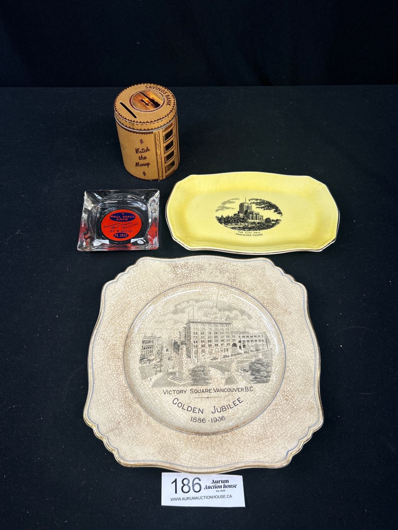 Vintage Vancouver Advertising Lot, Golden Jubilee Plate, City Hall Plate, Pall Mall Café Ash Tray and Piggy Bank