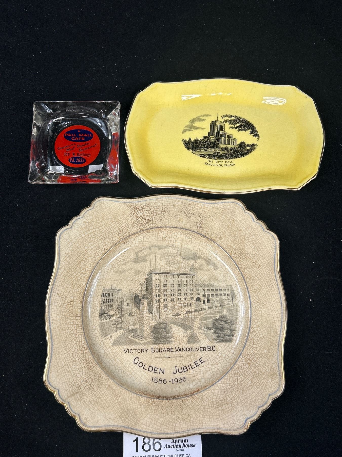 Vintage Vancouver Advertising Lot, Golden Jubilee Plate, City Hall Plate, Pall Mall Café Ash Tray an