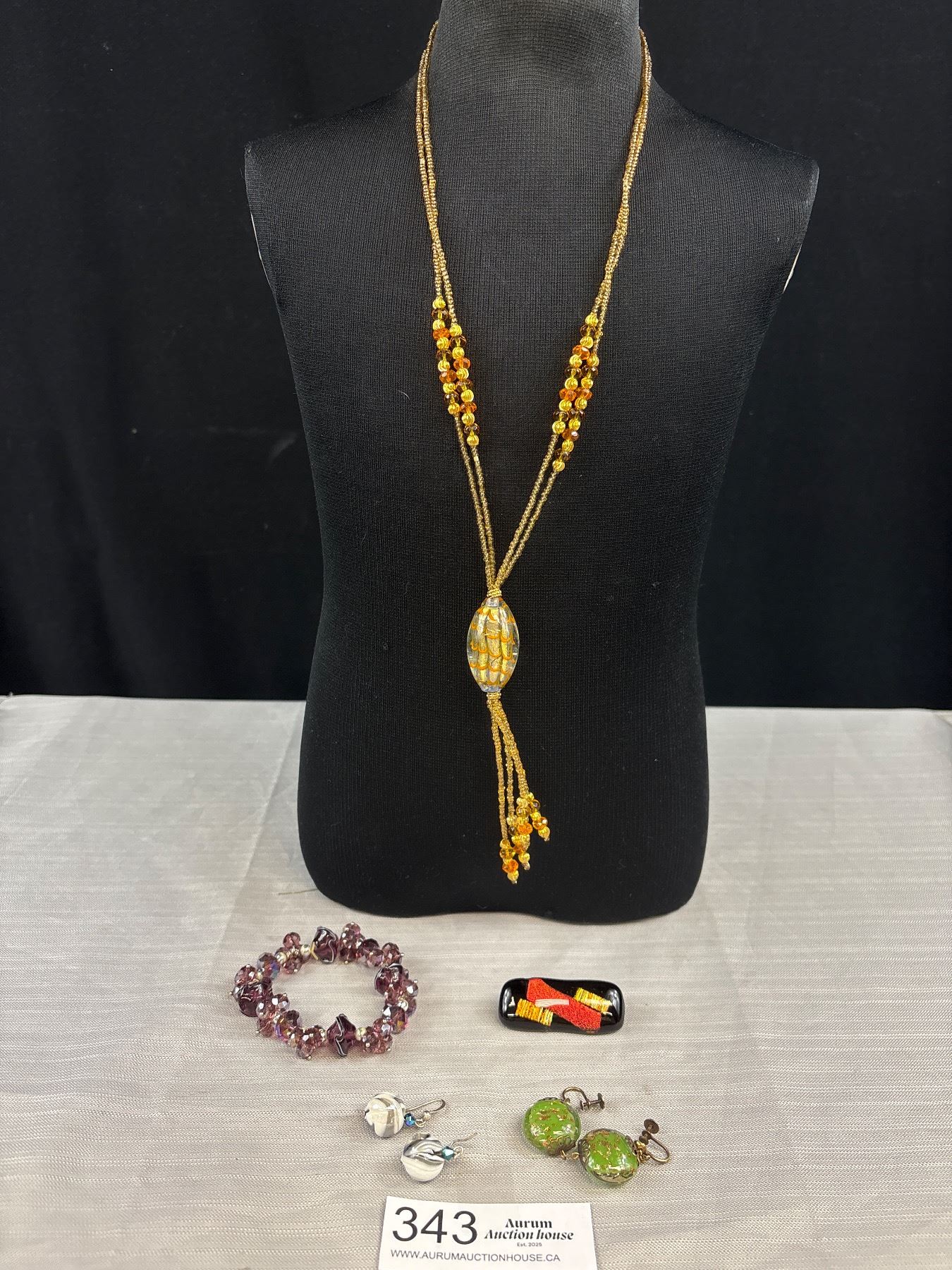 Vintage Venetian Glass Pendant Necklace + 2 Pairs of Earrings, Bracelet Brooch