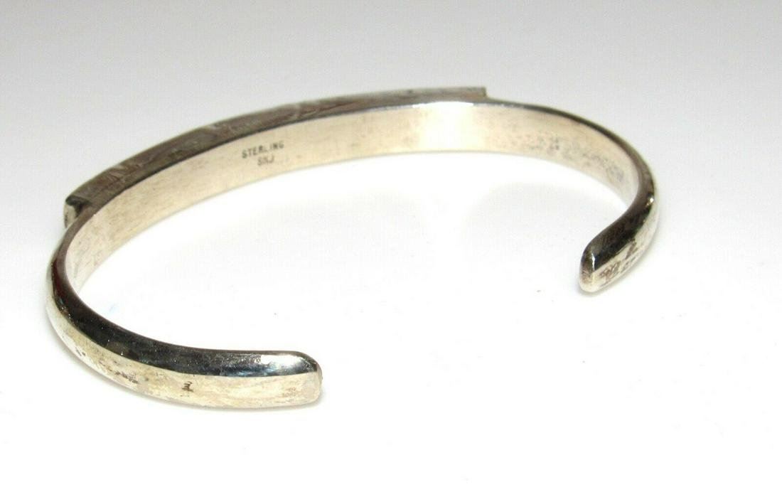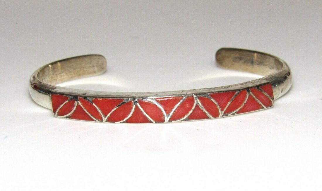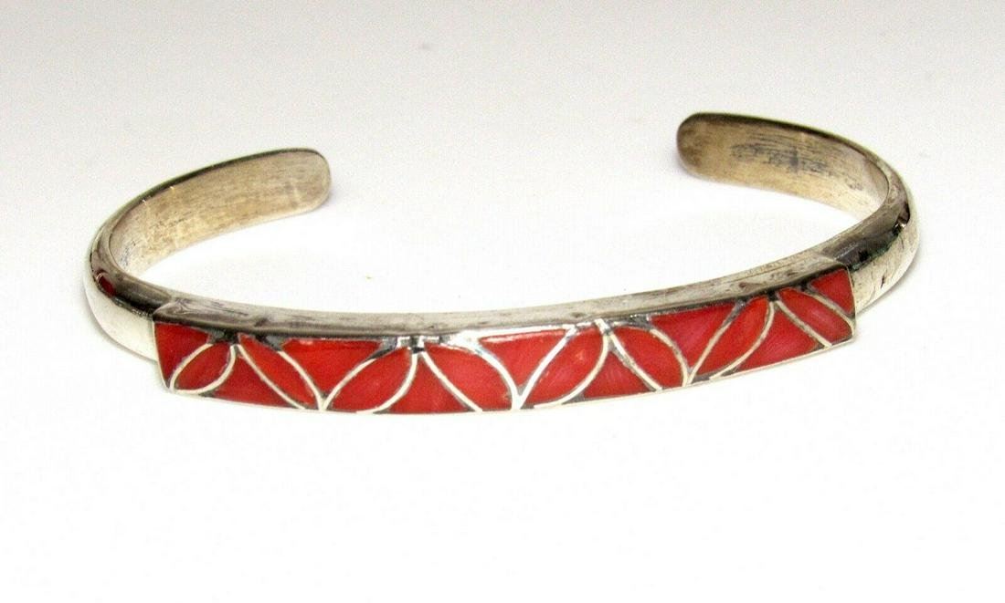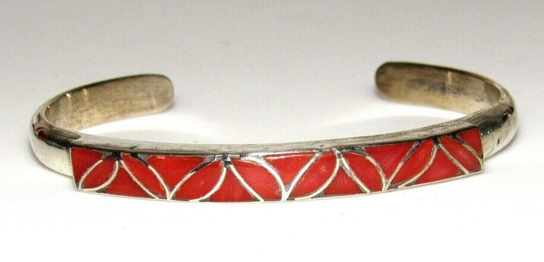 Vintage Zuni Coral Inlay Bracelet Sterling Silver Cuff