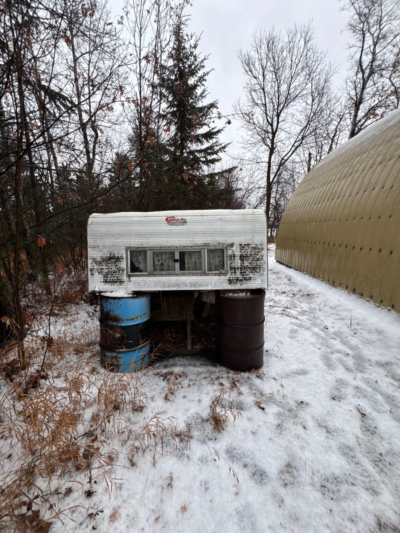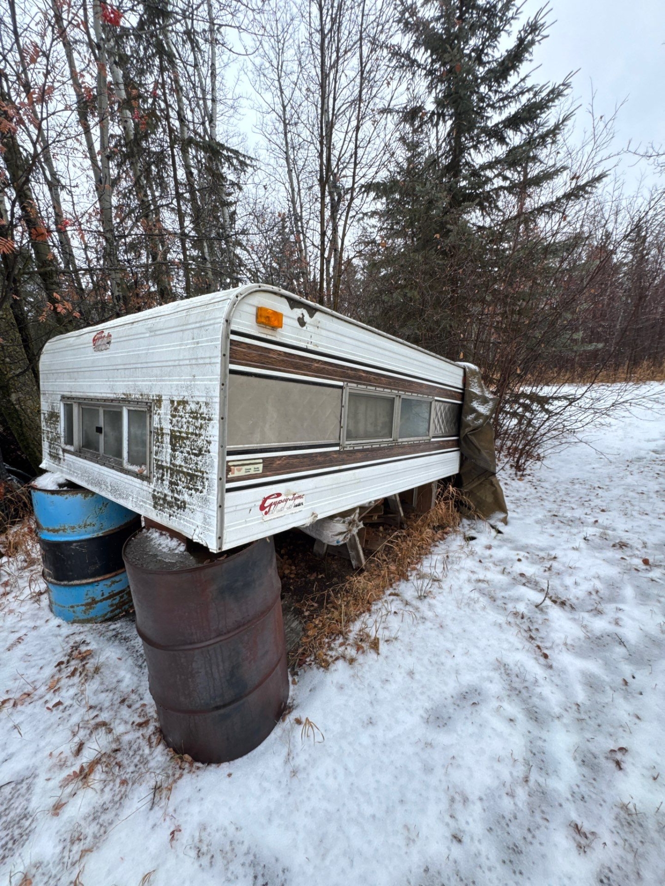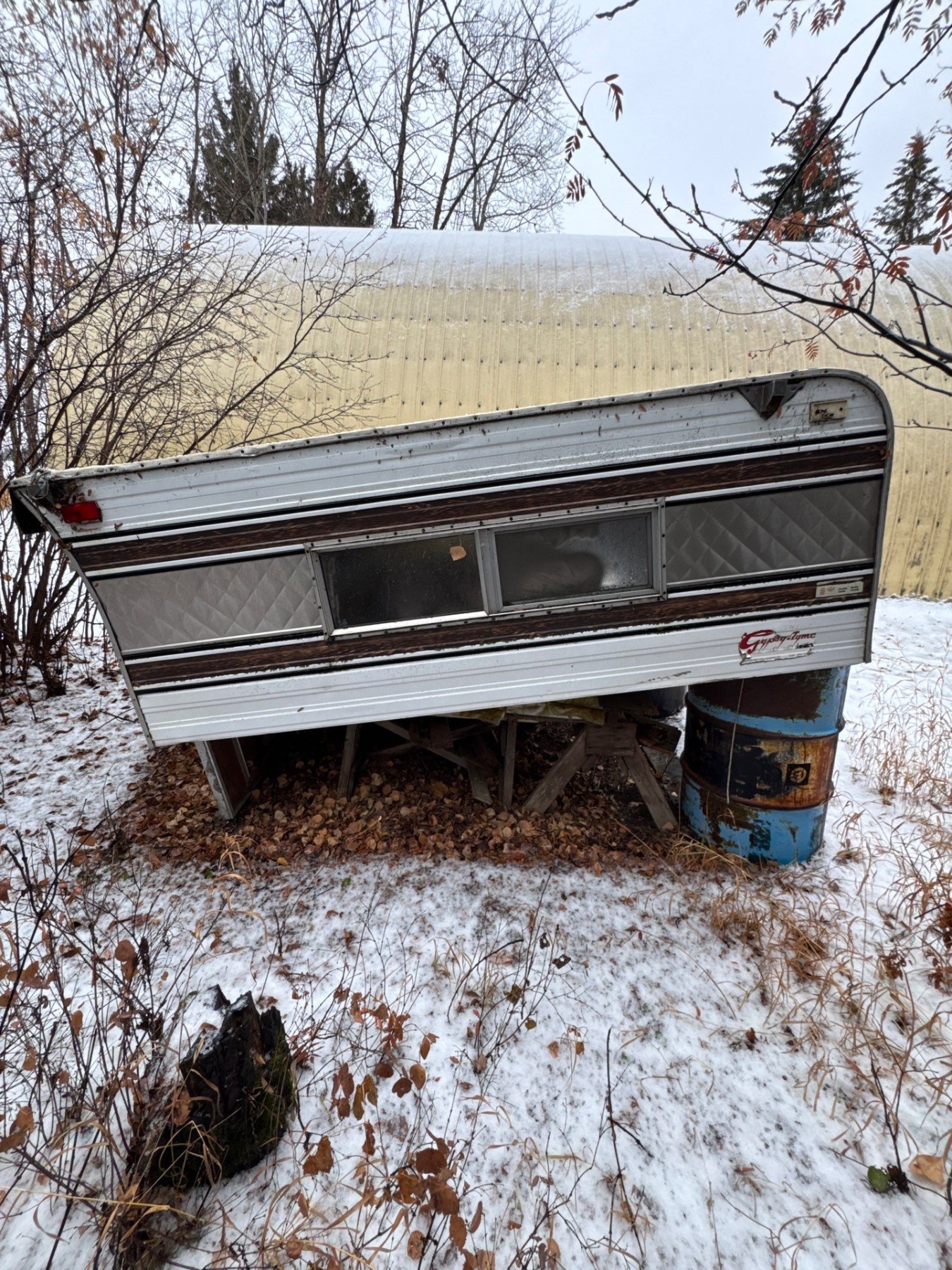 Vintage truck canopy. Barrels, good for bear baiting. Saw horses, all contents included.