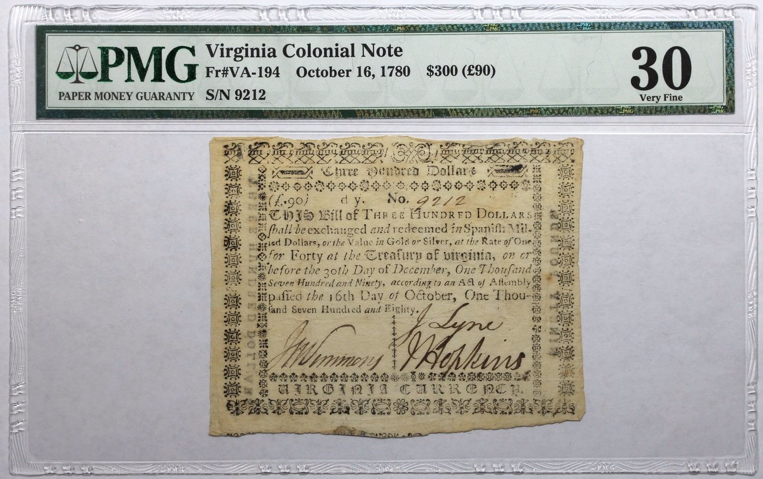 Virginia October 16, 1780 $300 Fr#VA-194 S/N 9212 PMG 30.