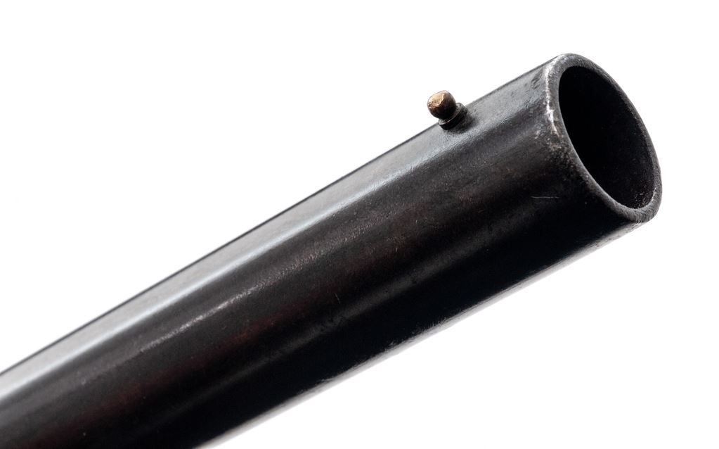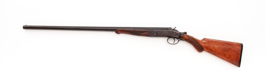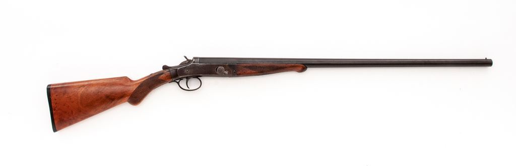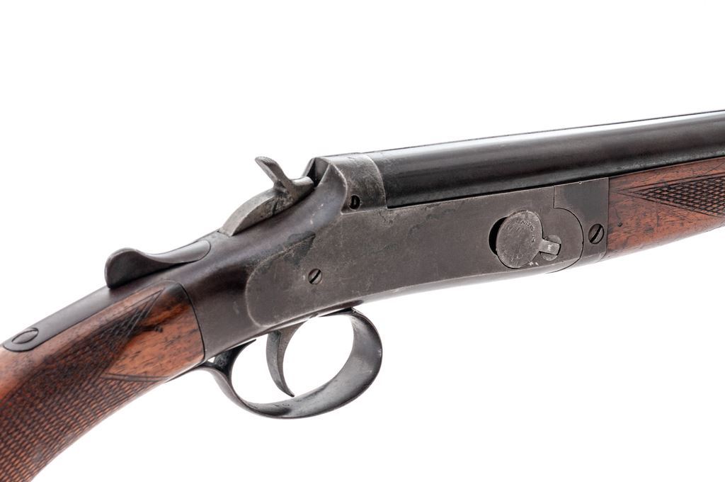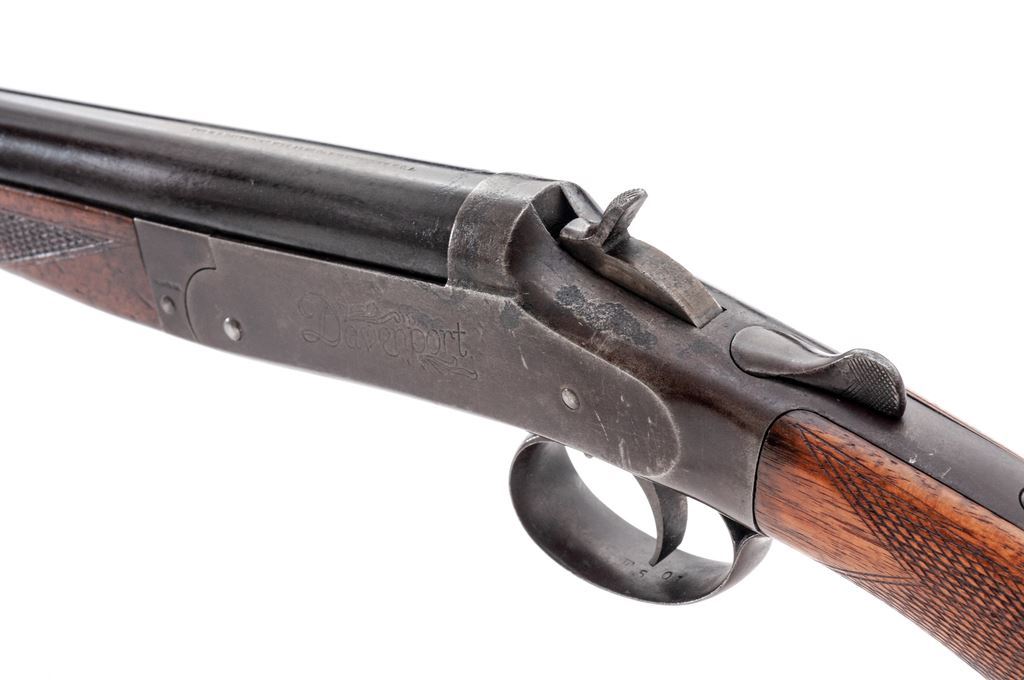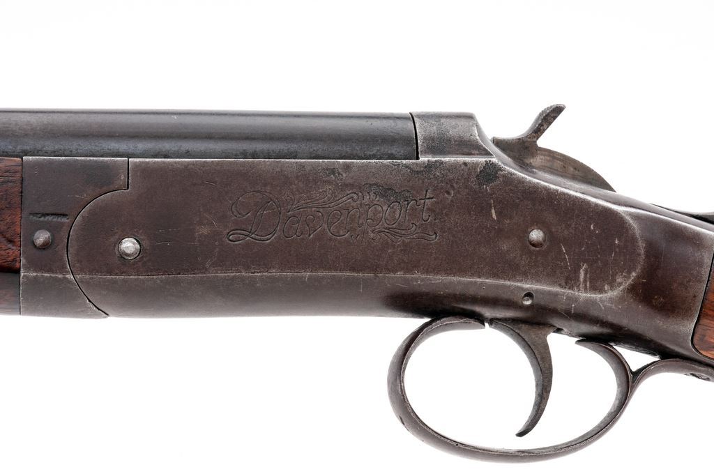 W.H. Davenport Firearms Co. Single Shot Shotgun, #501, 16 ga., 30" barrel with Cyl. bore, finish is now brown, checkered round knob walnut stock and Schnabel forend with black composite buttplate, brass bead front sight, and exposed hammer. Condition is good. Metal has a brown patina. There is some pitting on the receiver and rear portion of the barrel, near the chamber. Factory lettering is clear. Wood shows signs of moderate age and wear, with scattered surface dents and scratches. Buttstock has been lightly sanded and refinished, forend finish appears original. Action, hammer, and trigger operate smoothly. Bore has scattered patches of moderate corrosion, balance is bright. Est.: $100-$150. (C&R)