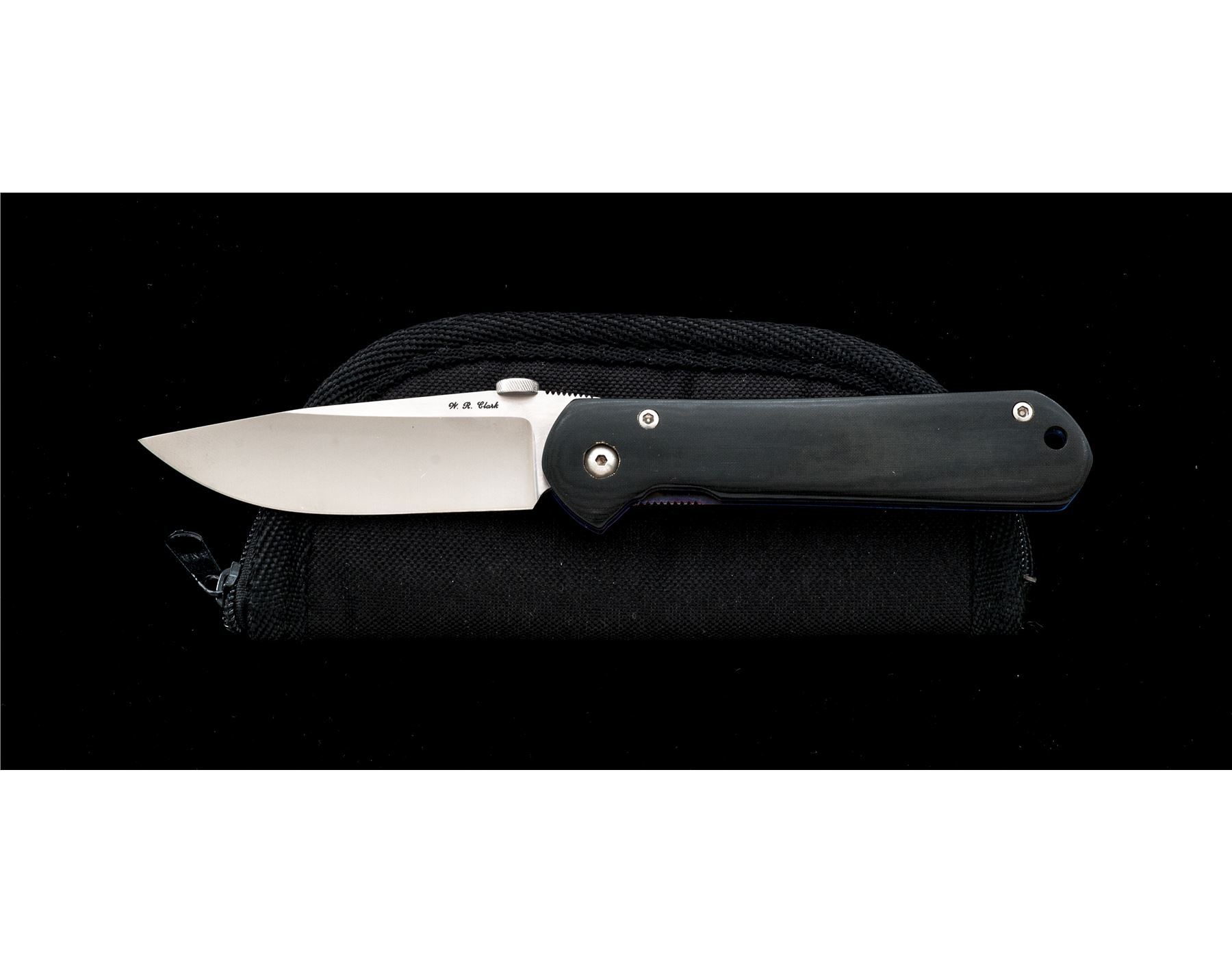 W.R. Clark Custom Linerlock Folding Knife, 3.5'' ATS-34 drop point blade, ambidextrous thumb stud, black micarta handles, with purple anodized liners. Top of the blade behind the thumb stud is notched for thumb traction. Left side of the blade is marked ''W.R. Clark''; right side with ''Bone'' logo. In excellent as new condition, never carried or sharpened. Blade with a few faint micro-scratches. Knife comes in a small padded case. Est.: $150-$250.