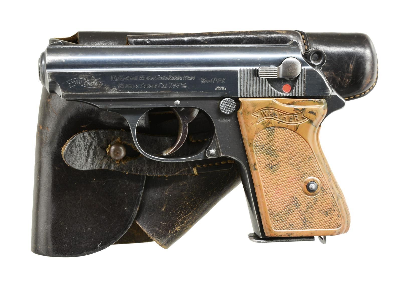 PPK W/ HOLSTER. Cal. 7.65mm. S# 304453K. Standard configuration w/ eagle “N” proofs, slide scratch numbered matching frame. Left side of slide & frame stamped w/ eagle & “WaA 358”. Brown plastic wraparound grip. Banner steel bottom mag. w/ cal. UNATTACHED ACCESSORIES: dark brown holster marked “D.R.G.M.” over crossed gun logo & “AKAH”. CONDITION: metal parts retaining approx. 85% original blue w/ considerable high edge & holster wear on slide w/ some freckling. Frame w/ high edge wear, mostly on left side. Blue lightening on front strap. Grip is very good w/ some shrinking & casting flaw on left side through banner. Bright bore. Mechanically fine. Holster is very good w/ normal creases & wear. (20-3202/MGM). CURIO. $2,000-3,000.