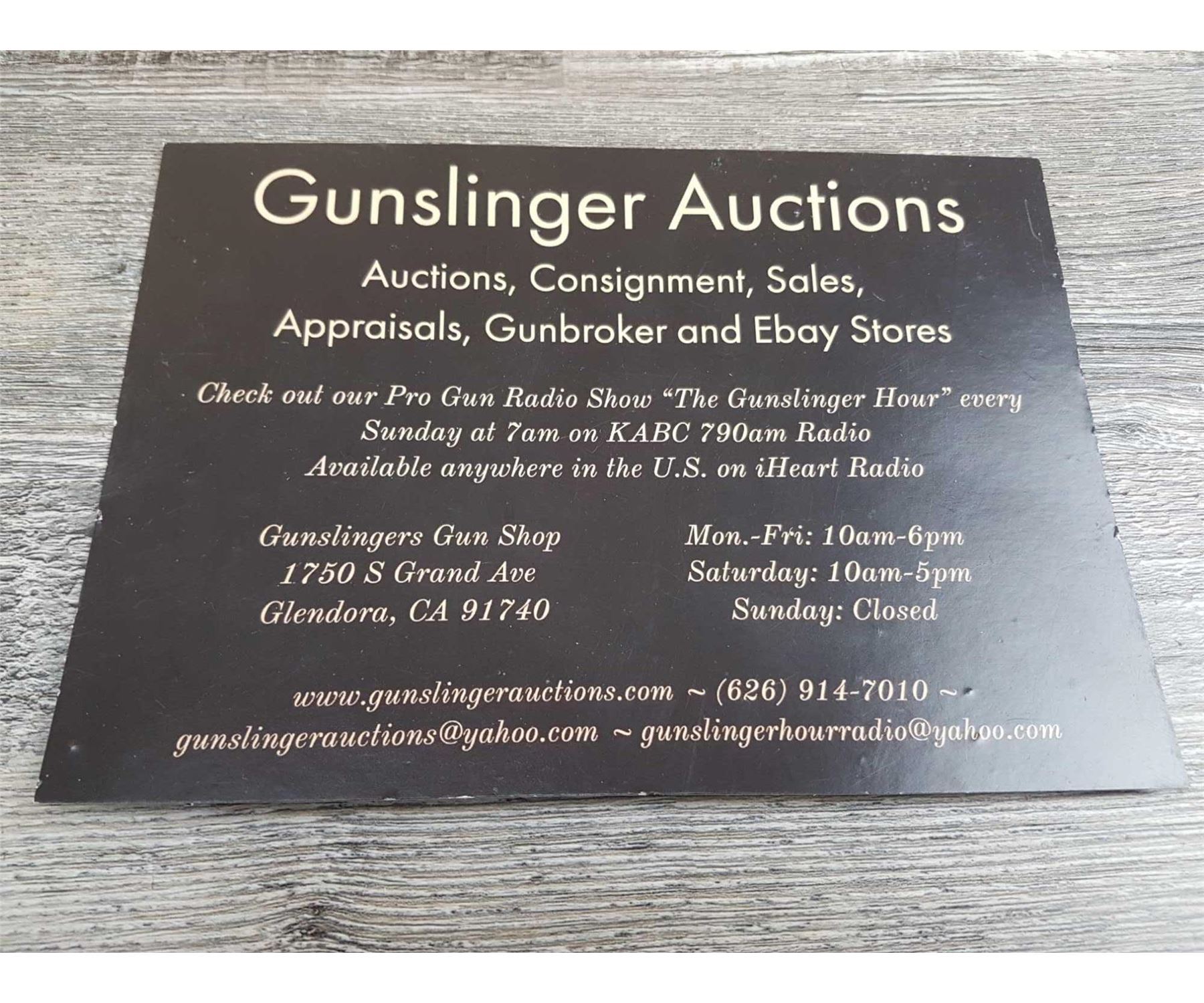 14. ALL FIREARMS WILL BE SOLD BY Gunslinger Auctions, a Federal Firearms License (FFL) Licensee in California. California BUYERS-Must pass the California Bureau of Investigations background check for all firearms. A $35 fee will be charged for the background check. If you do not pass the background check, you still must pay for the firearm(s), and they will be sold at a later auction and appropriate commission will be charged. Guns must be picked up by the purchaser at Gunslinger Auctions. All purchases will be charged to your credit card the day after the auction, once shipping charges are determined, your credit cards will again be charged for shipping. No one but the purchaser will be allowed to pick up the firearms. BUYER’S FROM OUTSIDE CALIFORNIA OR OUT OF AREA BUYERS- IMMEDIATELY FOLLOWING THE AUCTION YOUR CREDIT CARD WILL BE CHARGED FOR YOUR PURCHASES AND BIDDING FEE’S. YOU ARE REQUIRED TO Contact a Federally licensed firearm dealer in your state who will accept shipment and transfer the firearm to you in your state. YOU ARE RESPONSIBLE TO DETERMINE YOUR ABILITY TO PURCHASE A FIREARM IN YOUR STATE. IF YOU FAIL TO QUALIFY IN YOUR STATE YOU WILL THEN OWN A WEAPON THAT YOU CAN’T POSESS. ALL SALES ARE ABSOLUTELY FINAL ON THE DAY OF SALE. Gunslinger Auctions will arrange shipping on all firearms through a local pack/ship company or a national company of your choice. The cost of the shipping will be paid by the purchaser prior to shipment. HANDGUN’S REQUIRE OVERNIGHT SHIPPING. Visa, Master Card and American Express are accepted for payment. YOU MUST BE OVER 21 YEARS OLD TO BUY LONG GUNS. YOU MUST BE OVER 21 YEARS OLD TO BUY HANDGUNS ATF FORMS WILL BE FILLED OUT ON ALL GUNS, with the exception of pre 1898 antique's. Gunslinger Auctions has not fired any firearm in this auction (Unless otherwise noted). As such we cannot and do not warranty these items. Our conditions range from New in Box, Outstanding, Excellent, Very Good, Good, Fair & Poor. Please pay attention to our ratings. They are our opinions ONLY, so you should make every effort to inspect them yourselves.