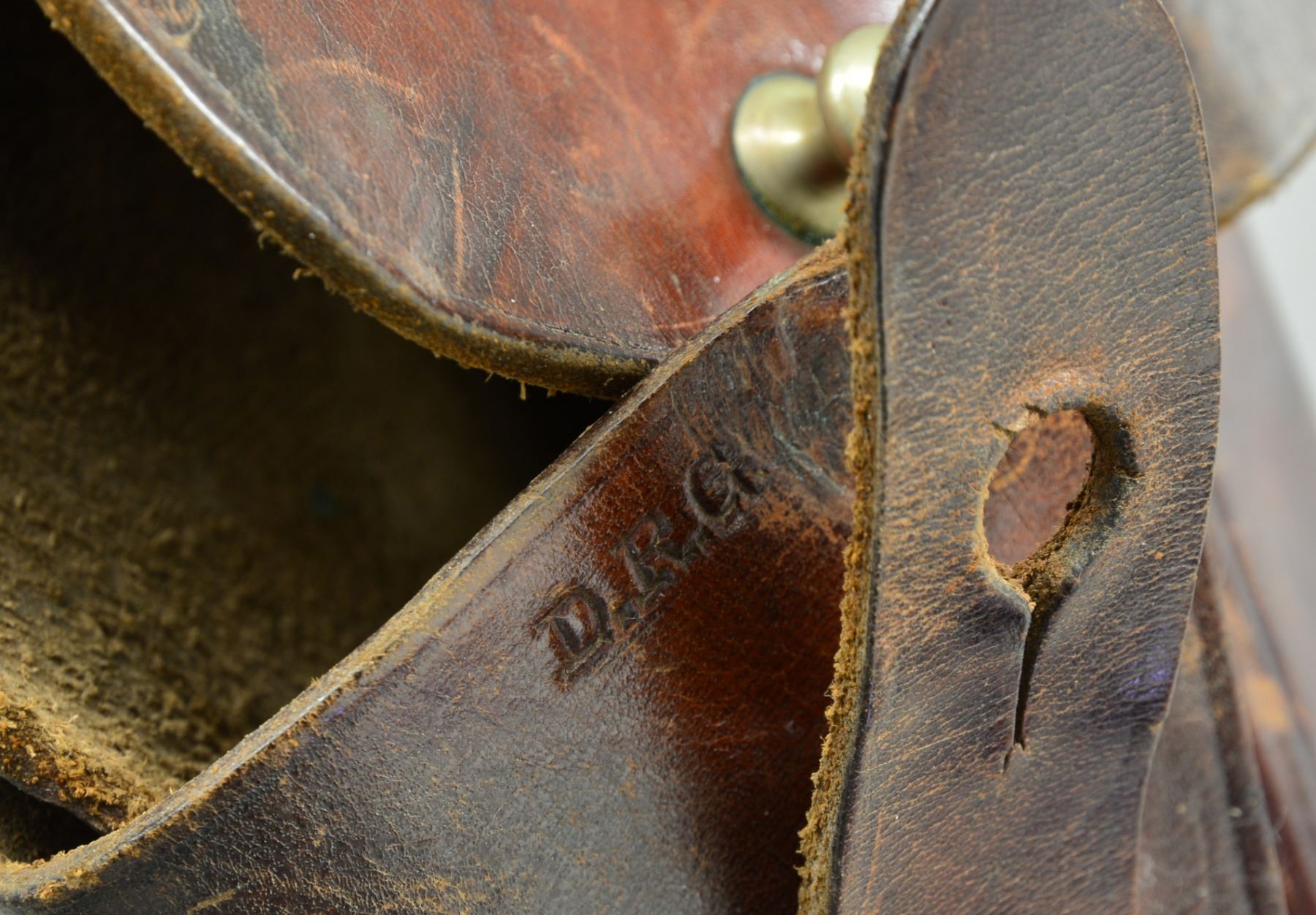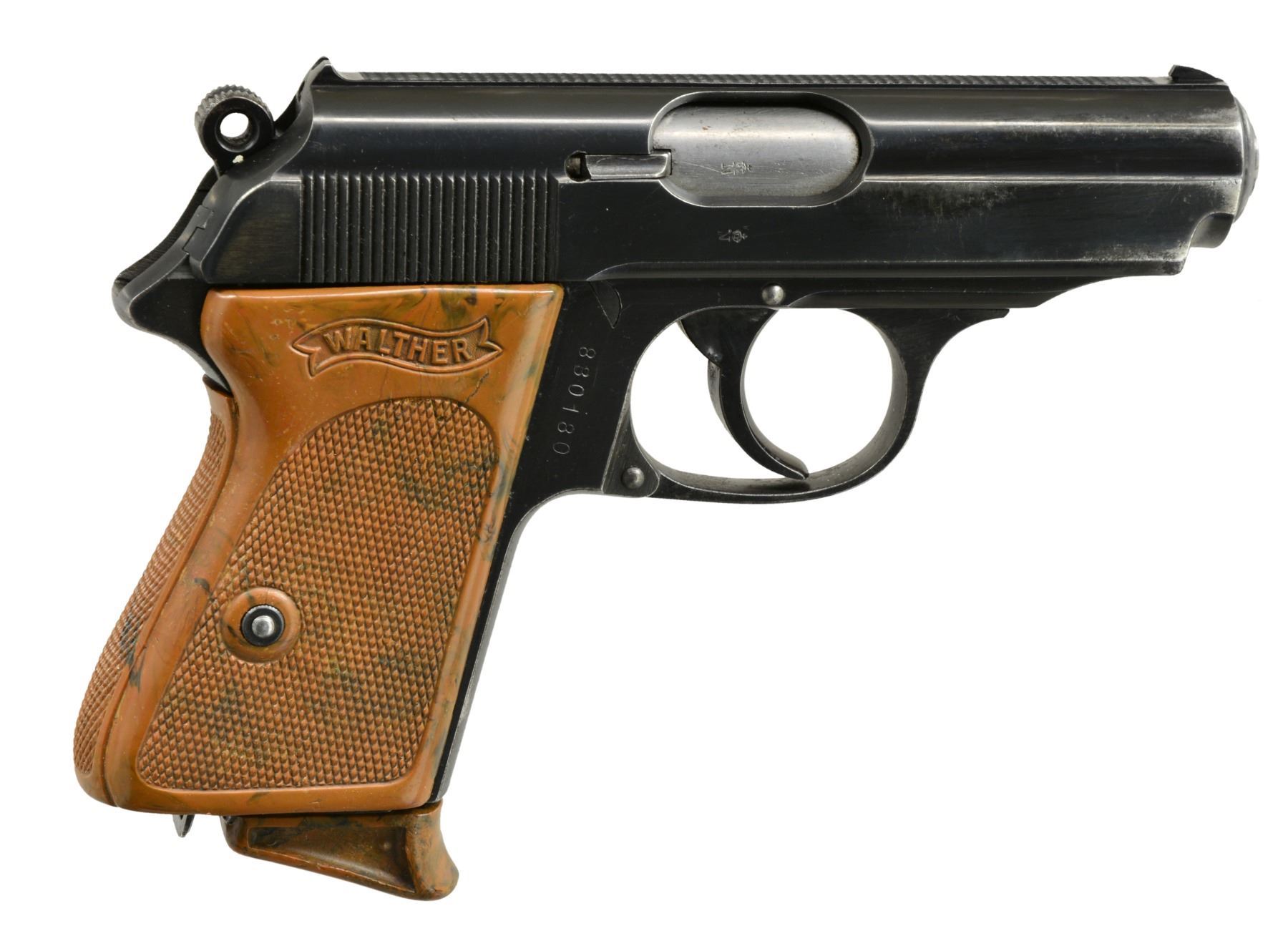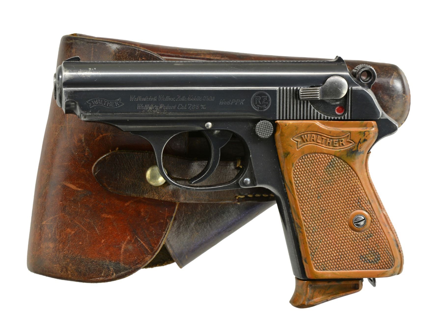 Cal. 7.65mm (32 ACP). S# 830180. Bbl. 3 1/4". Mfg. 1935 w/ "RZM" marked matching numbered slide & appropriate early crown N proofs. Mottled brown Walther banner checkered plastic grips. 90 Degree slide safety w/ red marked fire position. Standard lanyard loop at butt. MAGS: 2 Walther banner marked 7 rd.; 1 good plus w/ slight peppery oxidation & mottled brown plastic finger extension; 1 w/ flat base missing push button retainer having areas of cleaned moderate pitting. UNATTACHED ACCESSORIES: good plus brown dbl. flap holster having stud & strap retention w/ spare mag. pouch plus single wide belt loop. Top of inner flap marked "D.R.G.M." w/ Akah crossed cannons logo. CONDITION: good plus overall appearance w/ slight cleaned light pitting on right side of slide forward of port & at muzzle. Some slight peppery oxidation at various areas including frontstrap. Very minimal separation of nice grip at bottom of frontstrap w/ slightly more at tops having slight flare. Near excellent bore. (20-938/NW). CURIO. $2,000-3,000.