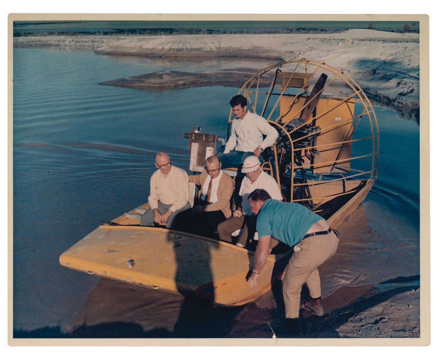 (Walt Disney World, c.1960s) A photograph of Roy Disney, Mel Melton, and three other men, preparing to survey the waterways of the future site of Walt Disney World via airboat. Measuring 8.25"x10", the unique kodak photograph print originally belonged to Mel Melton, and is in very good condition, exhibiting only minor toning, few spots of discoloration, and little wear from age.