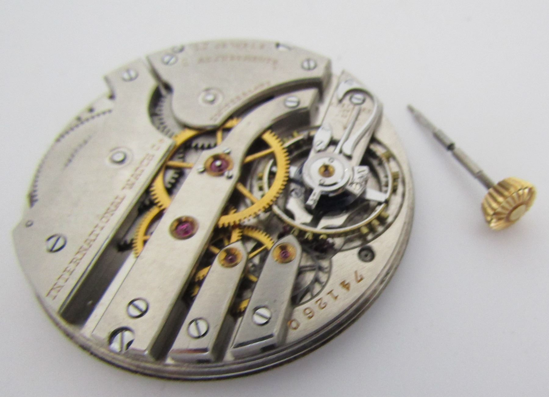 VINTAGE ESTATE MOVEMENT SIGNED "INTERNATIONAL WATCH CO. 17 JEWELS, 6 ADJUSTMENTS SWITZERLAND". 33MM WIDE. USA SHIPPING $5.