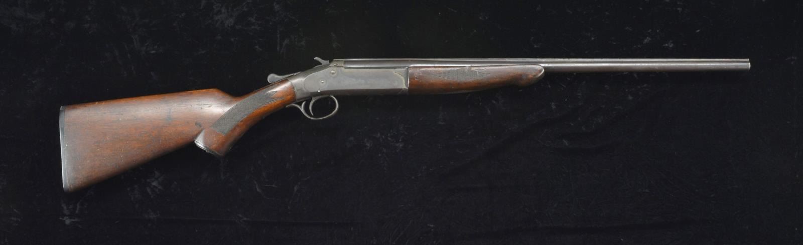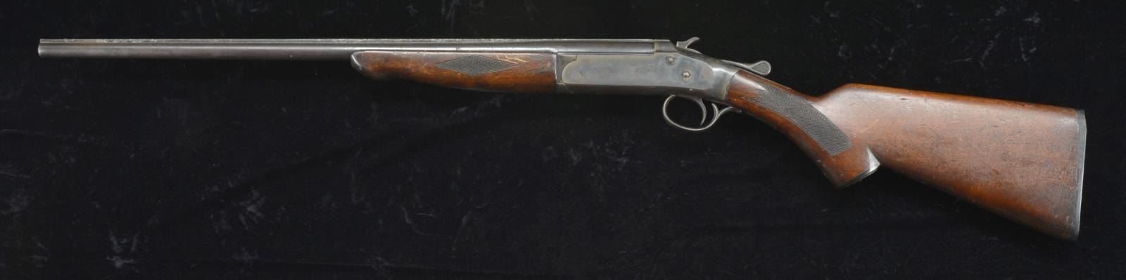 Cal. 410. S# 92284. Mfg. by Iver Johnson for Montgomery Ward. Bbl. shortened to 22 1/2" w/ solid grooved rib & crude replacement brass stud. Choke is IC. Blue finish w/ case colored receiver. Exposed hammer. Schnabel tipped forearm & pistol grip stock of checkered walnut w/ hard rubber grip cap & buttplate. CONDITION: good overall w/ moderate handling marks throughout. Good metal finish fading to brown w/ peppery oxidation throughout. Buttstock has crazing finish, several sm. chips & a few lg. cracks. Good bore w/ light fouling. (22-2293/MD). MODERN. $250-400.