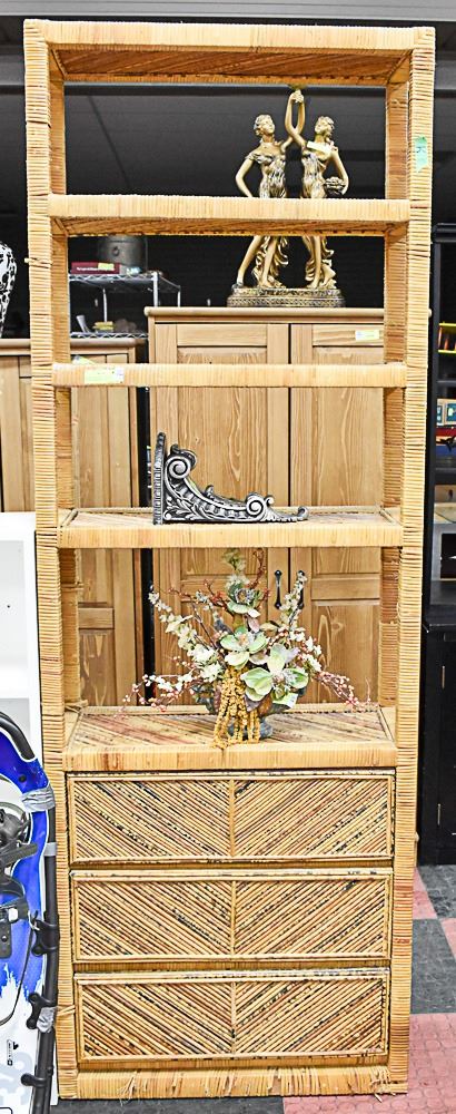 WICKER SHELVING UNIT W /3 DRAWERS 84" X 29" X 12"