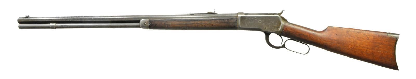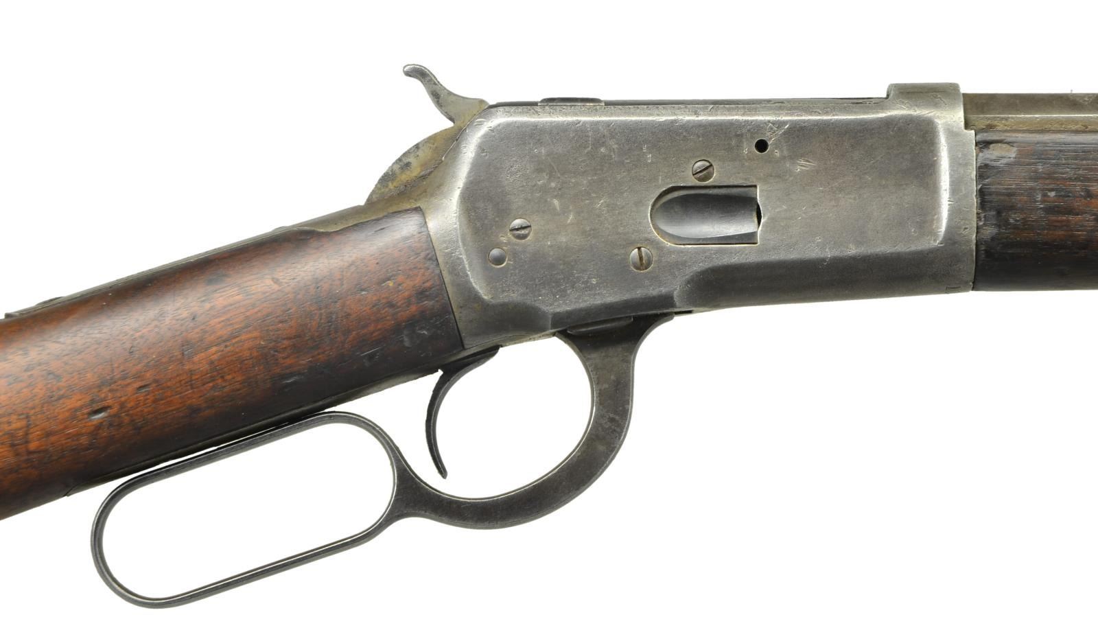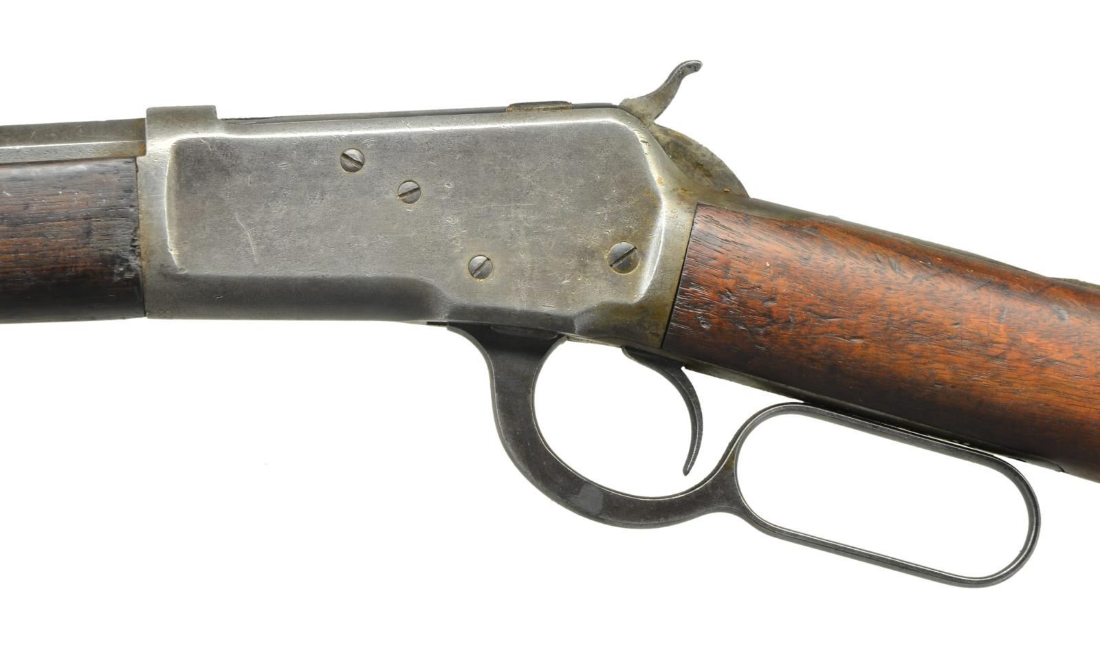 Cal. 38 WCF (38-40). S# 10288. Bbl. 24" oct. w/ sporting sights. Full length tubular mag. Walnut forearm & straight grip stock w/ crescent steel buttplate. Mfg. 1892, first year of production. CONDITION: metal has cleaned gray appearance showing pitting & handling marks. Wood shows heavy wear w/ dents, chips & gouges having cracks extending from buttplate. Functioning action. Dark pitted bore w/ worn rifling. PROVENANCE: Collection of John Montague. (01-20800/DS). ANTIQUE. $500-800.