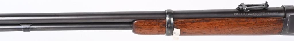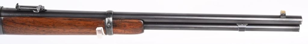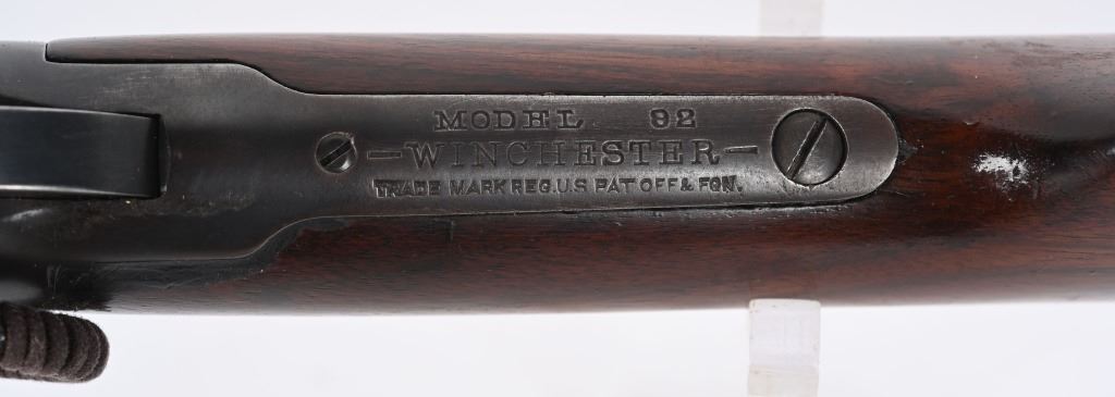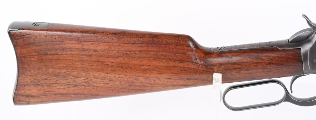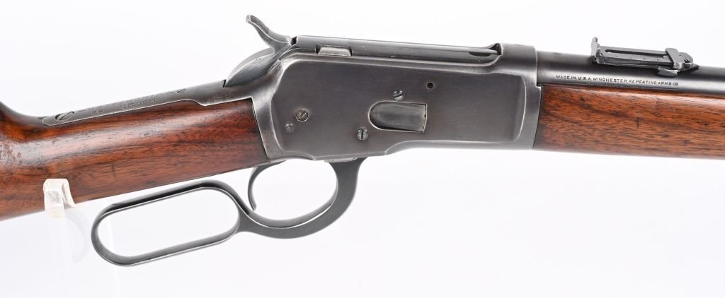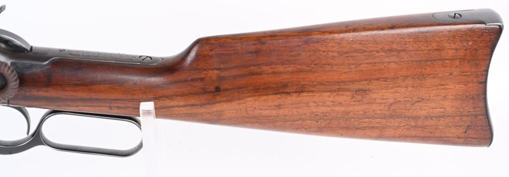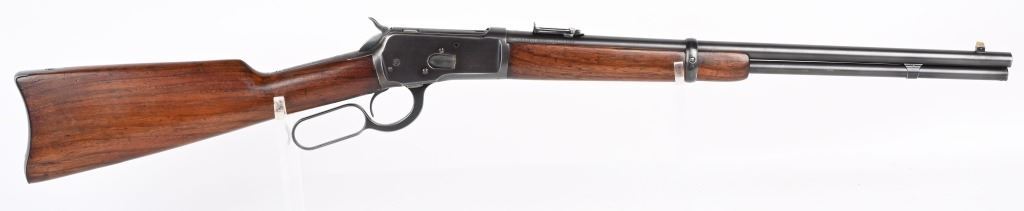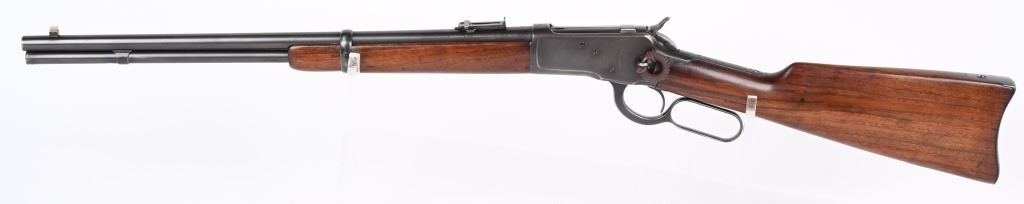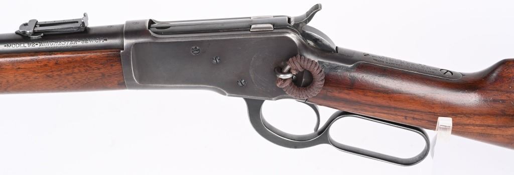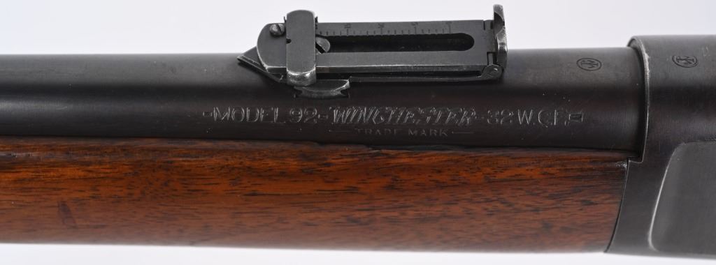 SERIAL NUMBER 948686 BARREL 20" CALIBER 32-20 WCF MANUFACTURED CIRCA 1921-28. Blue finished steel with oil finished straight grain American walnut stocks with carbine steel butt plate. Barrel mounted post & blade front sight with ladder adjustable rear carbine sight. Barrel marked with 2 line address on right side of chamber while left side has "MODEL 92 WINCHESTER 32 WCF" Winchester proofs on receiver bridge and top of chamber. CONDITION, Very good as refinished with 97% blue finish remaining, Brilliant bright bore. Action operates properly and locks solidly. Stocks are very good with a small repair at top left side of wrist and a filler were a butt swivel was removed. C&R