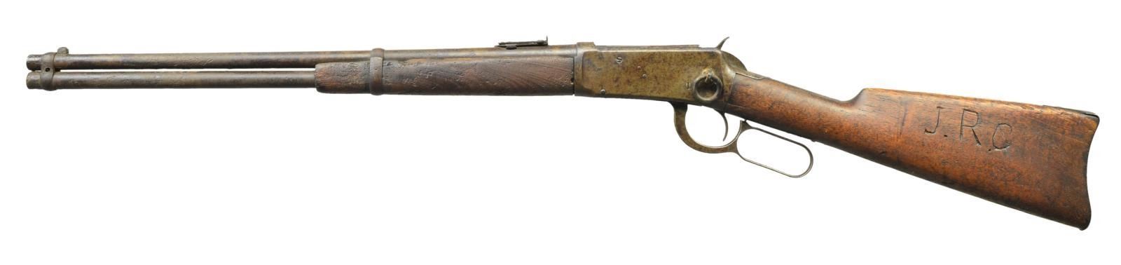 Cal. 38-55. S# 85638. Bbl. 20" carbine style w/ pinned blade front sight & graduated leaf carbine rear sight. Full length mag. Band fastened long wood walnut forearm & straight grip stock w/ steel carbine buttplate. Left side of stock has deeply cut initials "J.R.C". Mfg. 1897. CONDITION: metal has an unnatural gray/brown appearance w/ areas of deep pitting. Wood shows heavy wear w/ lg. gouges, dents, chips & cracks. Action shows wear w/ stiff operation. Rear sight blade is frozen. Dark, deeply pitted bore. (01-20431/DS). ANTIQUE. $250-400.