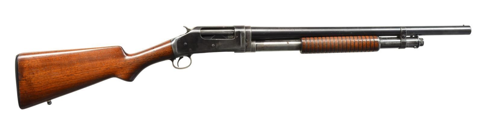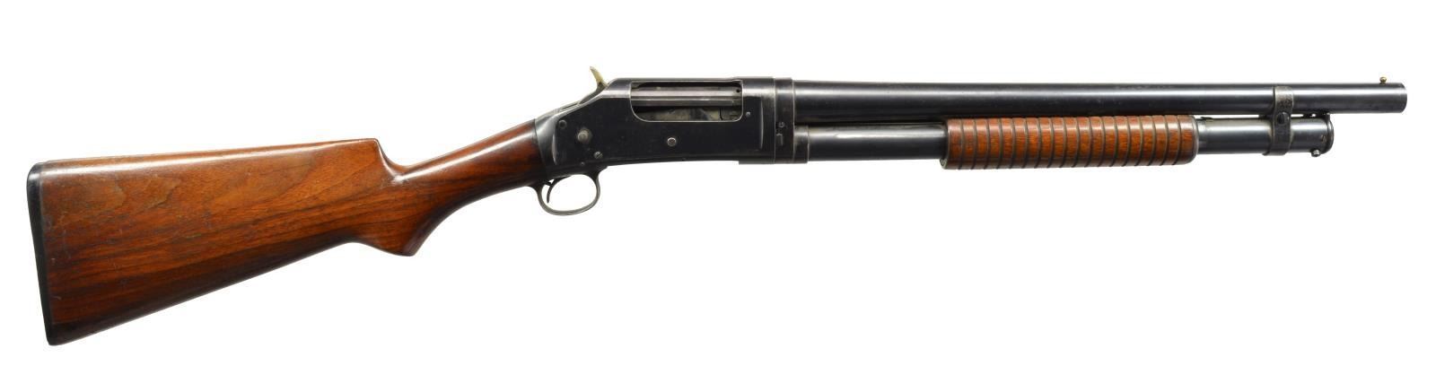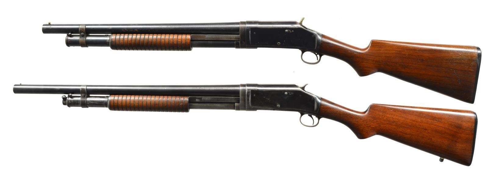 BOTH: cal. 12 Ga. 1) S# 624895. Bbl. is Model 97 replacement shortened to 20 3/4" w/ flaming bomb & "CYL" choke marking. Extension is unnumbered. Grooved forearm & pistol grip walnut stock w/ original buttplate having added swivel bases. CONDITION: bbl. retains 90% lightly worn blue showing scattered dents & spots of corrosion. Action retains 70% worn reblued finish. Wood has added finish over heavy wear. Stock has cracks extending from action. Buttplate shows heavy wear. Good bright bore showing some sm. scratches. (20-1492/DS). 2) S# 651185. Bbl. shortened to 18 1/8" w/ lg. brass bead & original "CYL" choke marking. Grooved forearm & pistol grip walnut stock w/ original buttplate. CONDITION: bbl. & action retain 70% dull lightly faded blue showing spots of corrosion & handling marks. Wood has lightly worn finish showing scattered scratches & marks. Hammer spur has brazed repair. Good bright bore. (20-1496/DS). BOTH CURIO. $700-1,000.