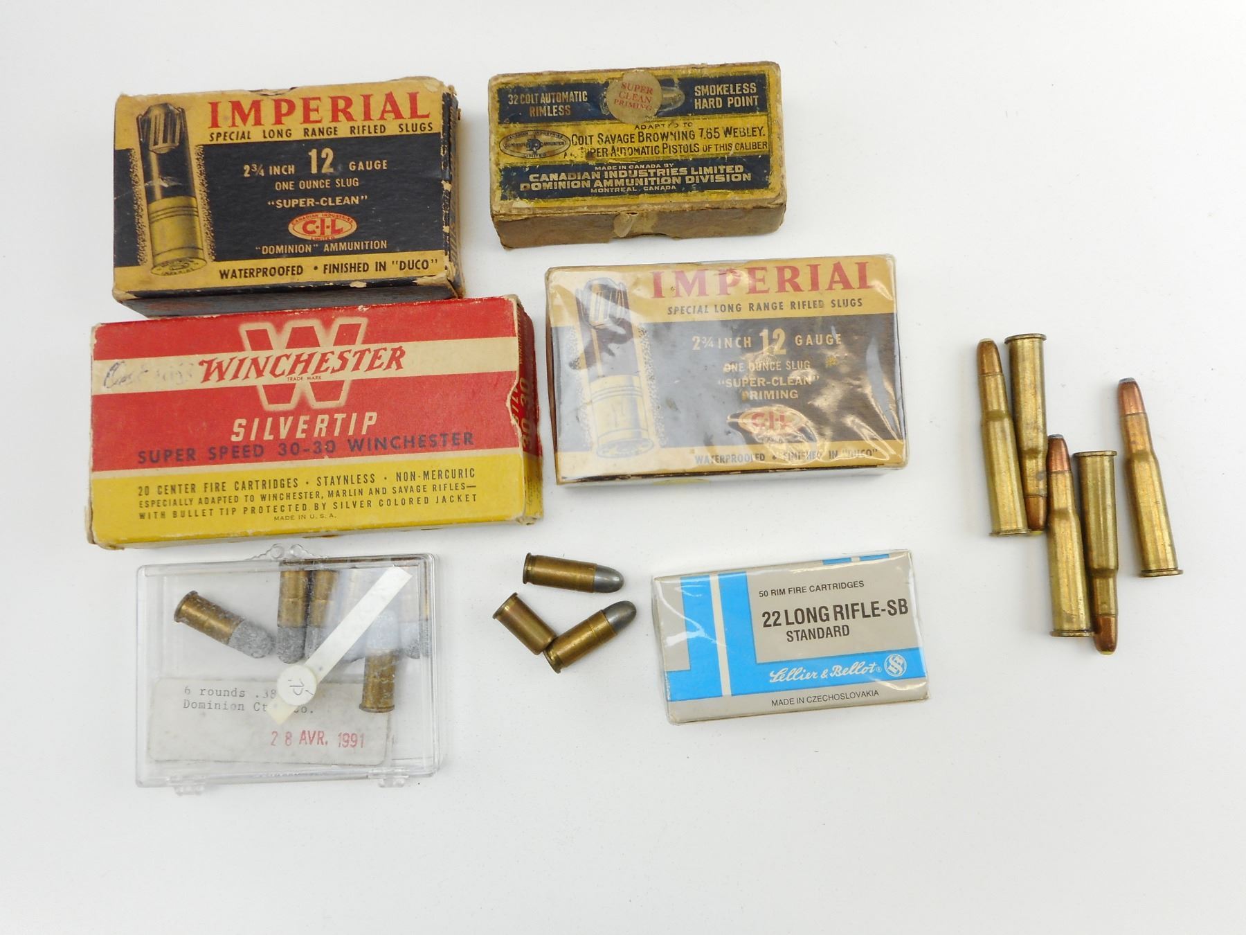 WINCHESTER 30-30 AMMO, DOMINION 32 COLT AUTO AMMO, IMPERIAL 12 GA. 2 3/4" SHOTGUN SHELLS, ASSORTED AMMO, 30-30, .38 S & W AMMO, 22 LONG RIFLE AMMO , 2 RNDS WINCHESTER 30-30 AMMO, 16 RNDS DOMINION 32 COLT AUTO AMMO, 9 RNDS 12 GA. 2 3/4" SHOTGUN SHELLS IN VINTAGE IMPERIAL BOXES, 5 RNDS 30-30 AMMO, 9 RNDS 38 S&W AMMO, 50 RNDS 22 LONG RIFLE-SB AMMO
