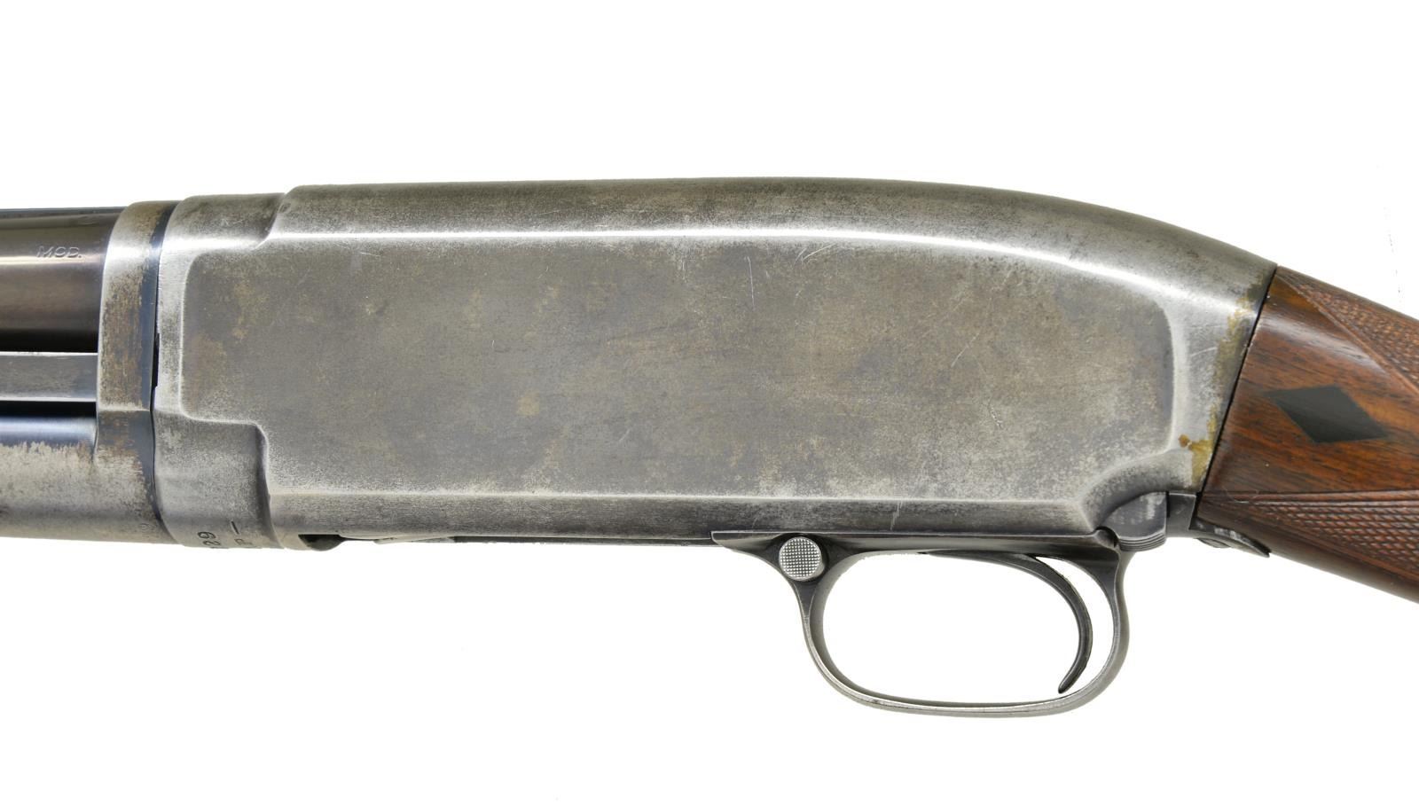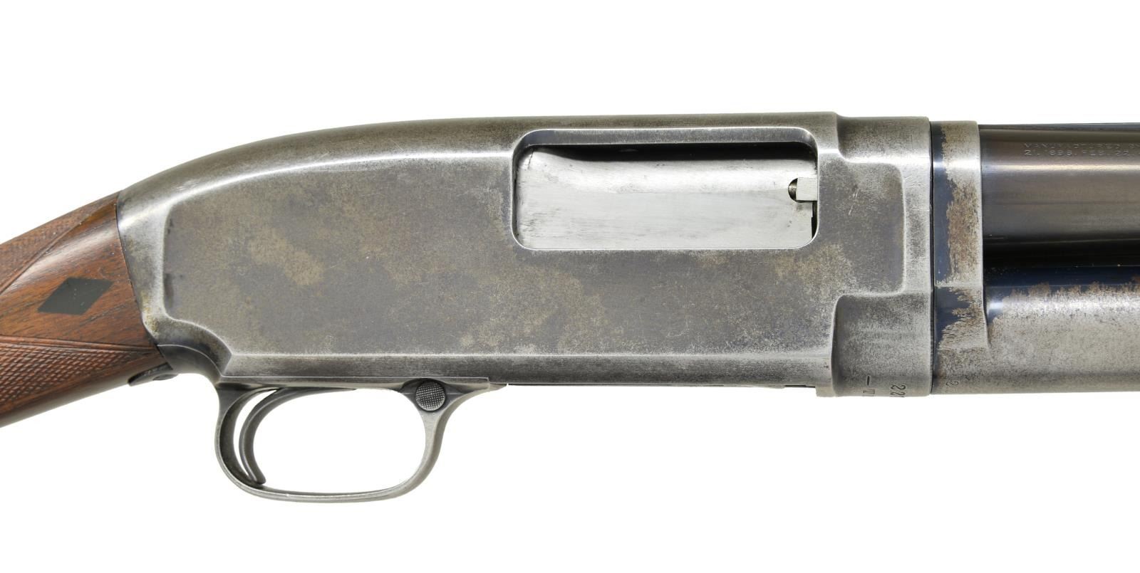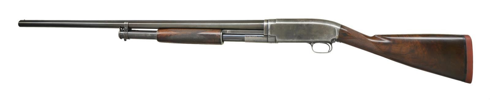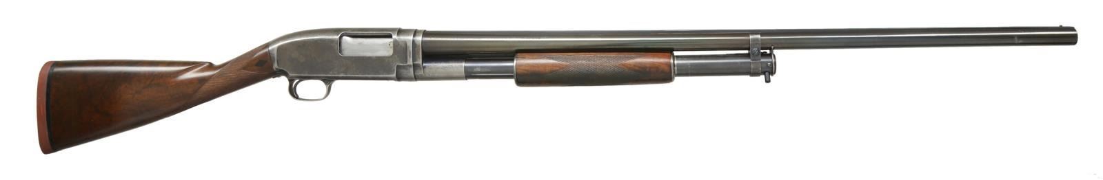 SHOTGUN. Cal. 12 Ga. S# 227229. Bbl. 30" Nickel Steel w/ solid rib & brass bead. Fixed Mod choke. Receiver below S# is marked "TRAP". Sm. rnd. forearm fancy walnut w/ wrap around trap style checkering. Straight grip stock of fancy walnut w/ checkering & Black Diamonds. LOP shortened to 13 7/8" over an added solid red Winchester pad & 1 1/4" wood extension. Mfg. 1923. CONDITION: bbl. retains 95% reblued finish w/ a slightly plum cast. Mag. tube & action retain 40% blue showing flaking & wear. Refinished forearm has cracks extending from rear edge on both sides. Heavily sanded & refinished stock is undersize action w/ lowered comb having sm. cracks & chips around receiver. Sound action. Bore shows areas of light pitting. (21-2273/DS).