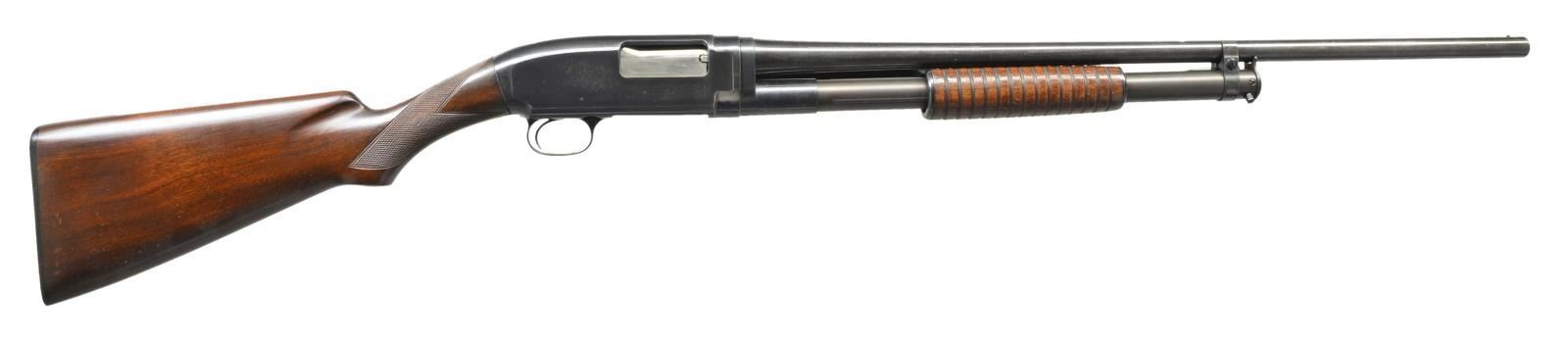 Cal. 20 Ga. S# 135155. Bbl. 25" w/ added full length matting. Fixed Full choke w/ brass bead. Receiver extension is renumbered to match. Sm. rnd. grooved forearm. Early style pistol grip walnut stock w/ added Tournament style checkering. LOP: 13 5/8" over original buttplate. 1916 Mfg. CONDITION: over 90% lightly faded blue w/ enough wear to appear original. Bbl. has a slightly plum tone. Forearm has worn finish w/ handling marks. Stock has very good refinish showing scuffs along right side. Pitted bore. (21-2188/DS). CURIO. $500-650.