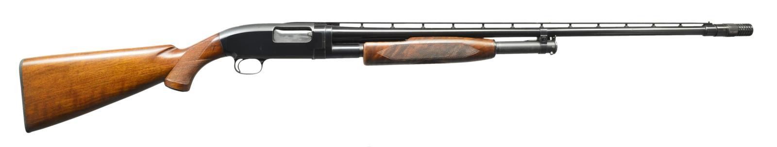 Cal. 20 Ga., 2 3/4". S# 1212041. Bbl. 30 1/4" over aftermarket vented adj. Poly-Choke. Aftermarket Simmons sm. rnd. donut post VR. Original choke marking "FULL". Brass front bead w/ white mid bead. Beavertail forearm of fancy walnut w/ Skeet style checkering. Hard rubber capped pistol grip Skeet dimension walnut stock w/ hand checkering. LOP: 14" over original buttplate. CONDITION: over 90% blue showing edge & slide wear w/ takedown marks on left side. Set screw at back of VR is missing. Refinished wood has freshened checkering. Stock has sm. hairline crack extending from right side of action. Very good bright bore. (21-2149/DS). CURIO. $400-600.